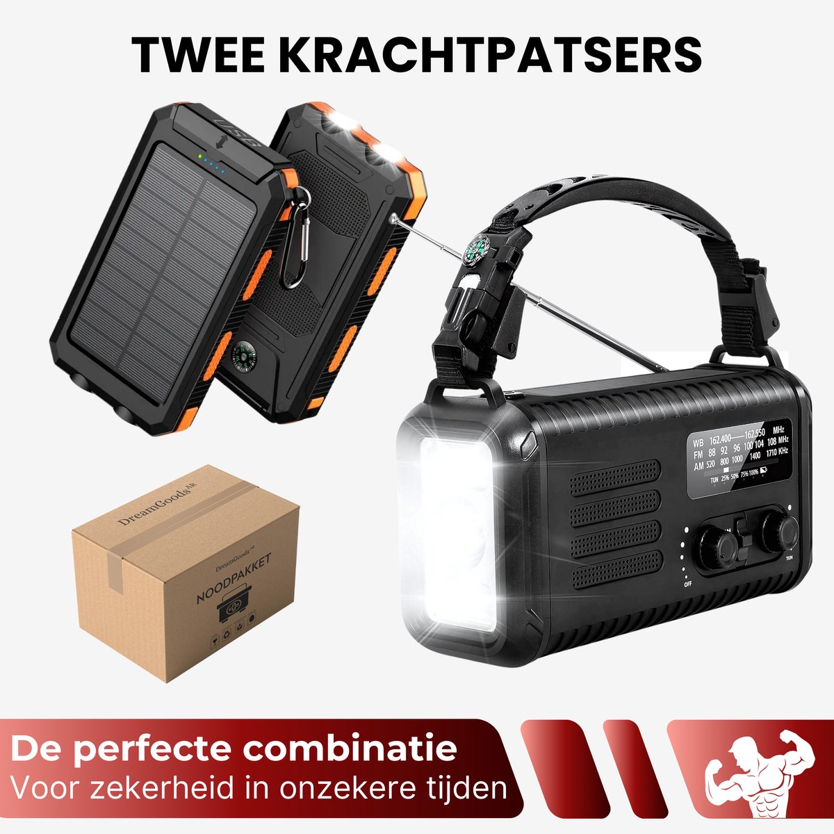 Het pakket bevat naast de hoofdunit een extra draagbare solar powerbank van 20.000mAh en een ruime set survival- en EHBO-items. In één zin: een complete, robuuste kit voor wie veiligheid en zelfredzaamheid serieus neemt.