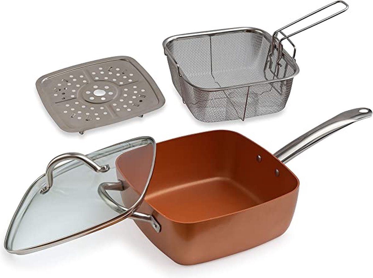Deze diepzijdige vierkante frituur-set is een multifunctionele, ruimtebesparende pannenset, ideaal voor Nederlandse gezinnen die gezonder willen koken. De set bevat een 24 cm pan (4,7 liter) en is vervaardigd uit hoogwaardig aluminium met koperen tint, geschikt voor alle kookplaten.