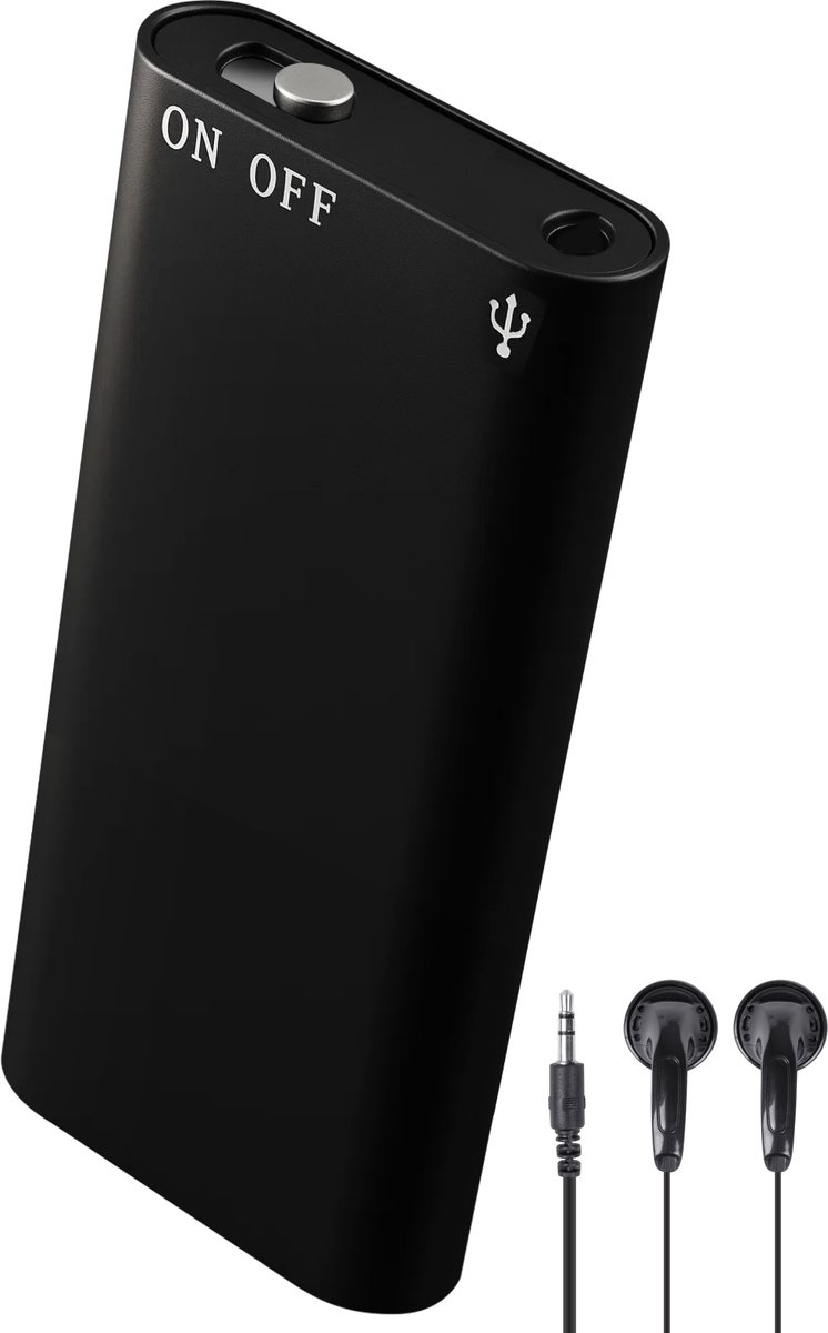 • Schakel het apparaat in met de enige knop; volgens de omschrijving is dit voldoende om op te nemen. Omdat er geen gedetailleerde handleiding in de listing staat, is het aan te raden bij ontvangst eerst een korte testopname te maken en die terug te luisteren met de meegeleverde oortjes. Zo controleer je microfoonniveau en opnamebereik.