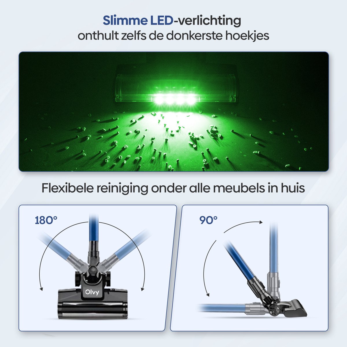 De Olvy 2-in-1 steelstofzuiger is een draadloze oplossing die stofzuigen en dweilen combineert in één wendbaar apparaat. Het is een snoerloze stofzuiger zonder zak met krachtige zuigprestaties, een lange accuduur en een slimme modus die de zuigkracht automatisch aanpast aan het oppervlak. Vooral in huishoudens met meerdere vloertypen, huisdieren of kinderen, levert hij gemak en snelheid zonder het gedoe van kabels of een aparte dweil.