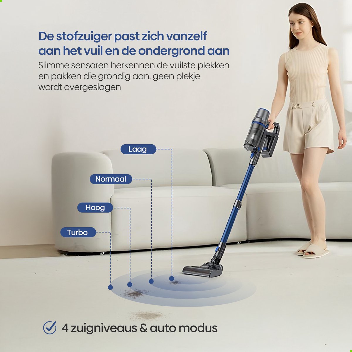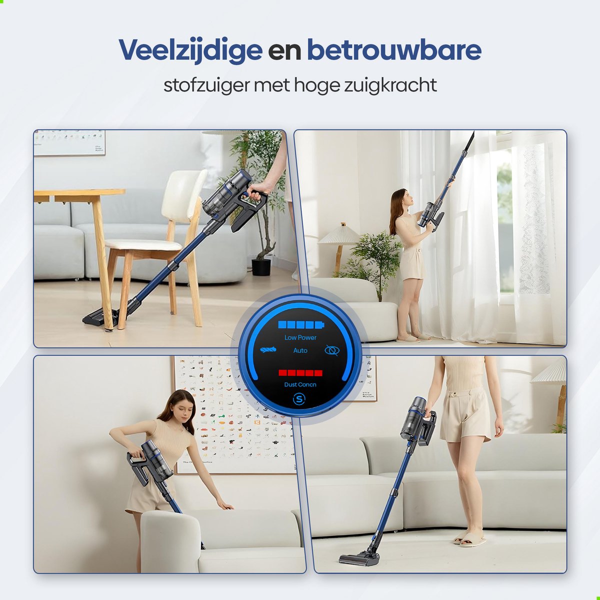 De LED-verlichting helpt verborgen vuil zichtbaar te maken, bijvoorbeeld onder lage meubels of op donkere vloeren. Het aanraakscherm bovenop maakt kiezen tussen standen eenvoudig en toont de status in één oogopslag. In drukke huishoudens, waar je snel klaar wilt zijn, zorgen deze twee functies samen voor snelheid en controle.