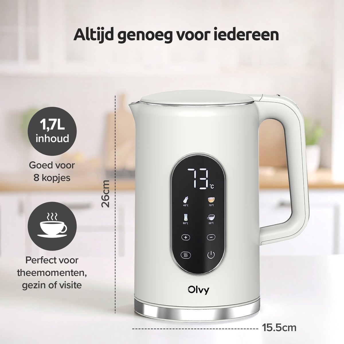 Stel Notificatie voor Product in: Olvy Waterkoker met Temperatuurregeling - Warmhoudfunctie - Kalkfilter - RVS - Dubbelwandig - Elektrisch - 1.7 Liter - 2200W - Crème Wit - €24,99