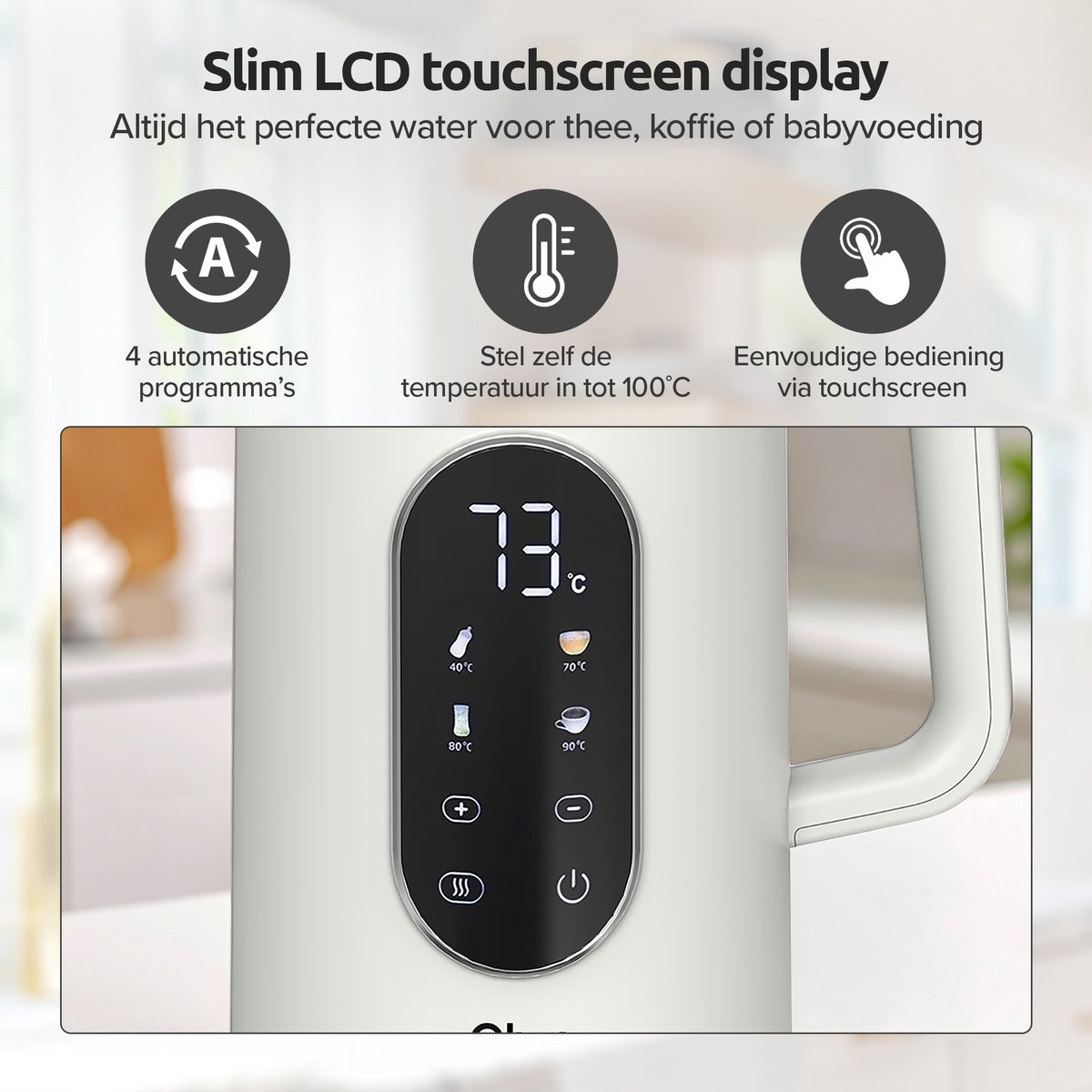 De temperatuur is nauwkeurig in te stellen—ideaal voor thee of het opwarmen van een babyfles. De interface is overzichtelijk en eenvoudig te gebruiken. Ik ben er zeer tevreden mee.