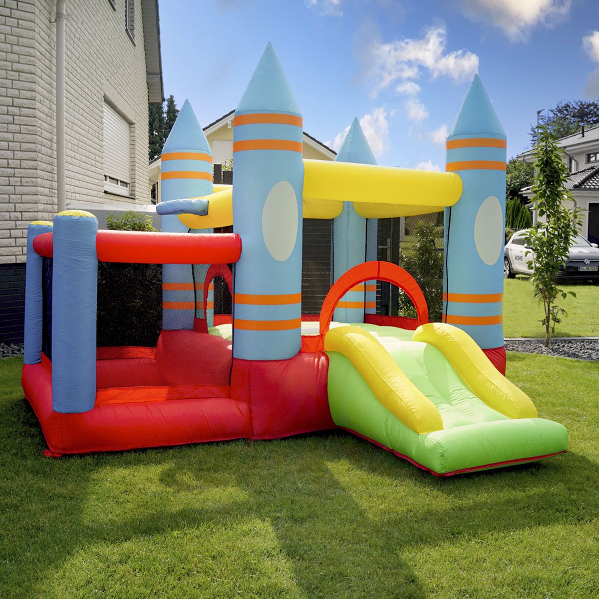 Overzicht:Het compacte springkasteel FABI is perfect voor Nederlandse tuinfeestjes en kinderfeestjes, met koninklijk kasteeldesign en vier torens. Met afmetingen 270 x 295 x 210 cm biedt het voldoende speelruimte en past het eenvoudig in de tuin.