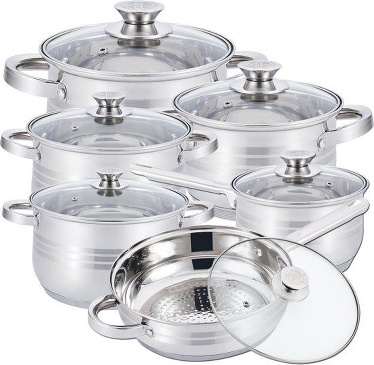 De set is compleet met diverse formaten (12-delig) voor veel kooktaken | Geen specifieke informatie over bodemsamenstelling of warmteverdeling (Niet listed) |