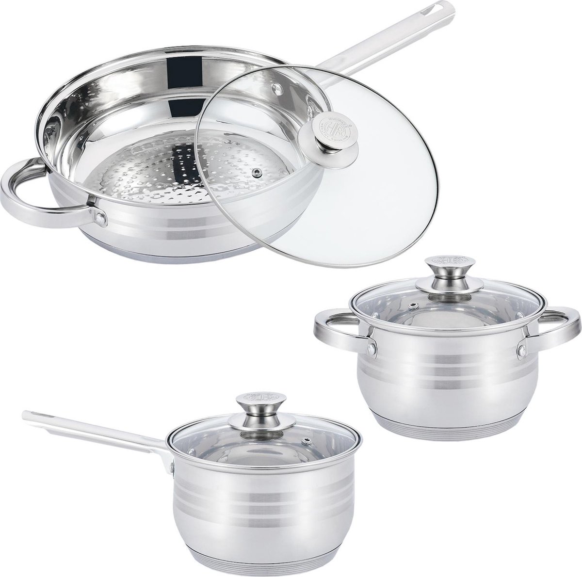 Roestvrij staal staat bekend om zijn duurzaamheid en krasbestendigheid; dat levert een set op die er langdurig netjes blijft uitzien. Het uiterlijk is vrij klassiek en past goed in zowel strakke moderne keukens als meer traditionele interieurs. Omdat de fabrikant materiaal en vaatwasbestendigheid vermeldt, zijn de pannen prettig in verzorging: je hoeft niet uren achter het aanrecht te staan om ze weer glanzend te krijgen.