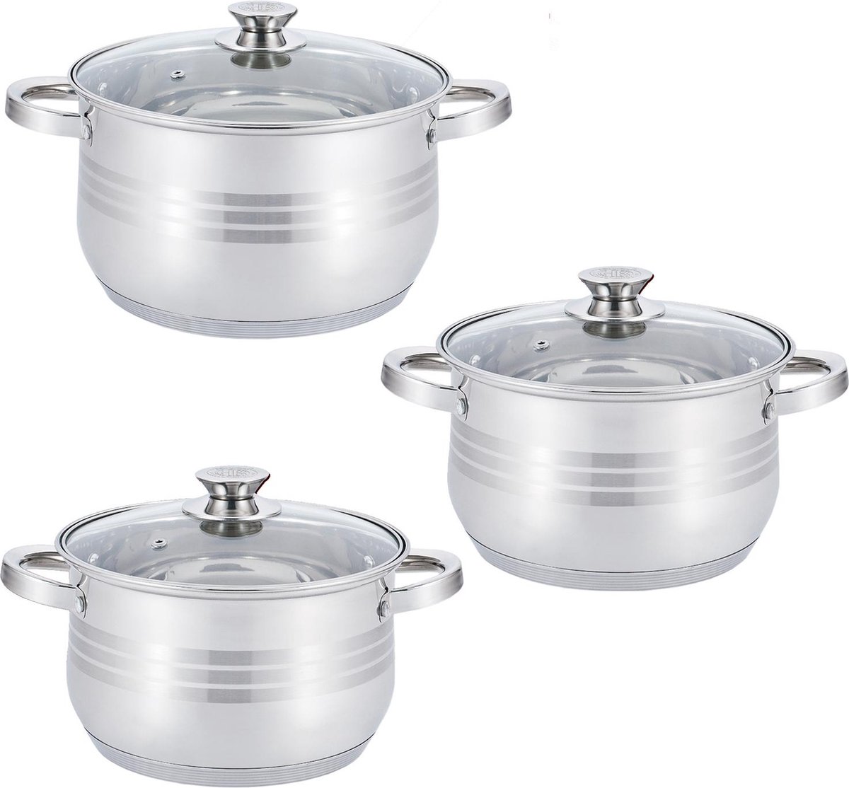 De pannen en handgrepen zijn uitgevoerd in roestvrij staal met subtiele strepen over de gehele breedte, wat de set een verzorgde en moderne uitstraling geeft. De deksels zijn van gehard glas met ronde RVS handgrepen, waardoor je tijdens het koken makkelijk zicht houdt op wat er in de pan gebeurt zonder telkens te moeten tillen.
