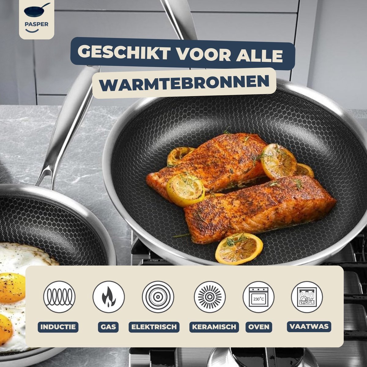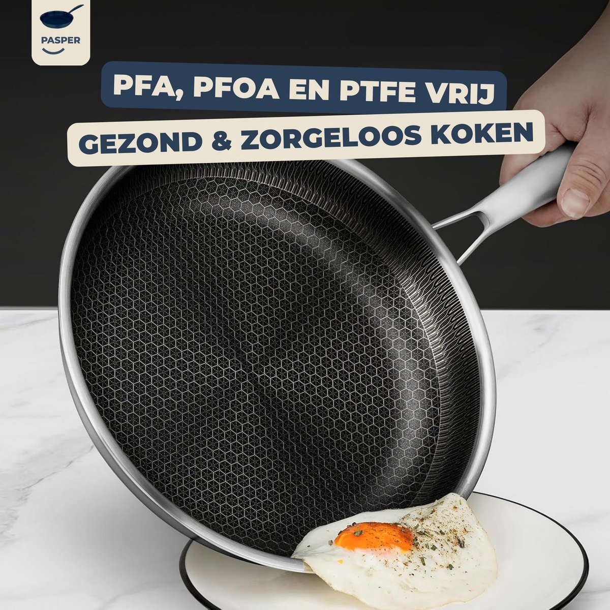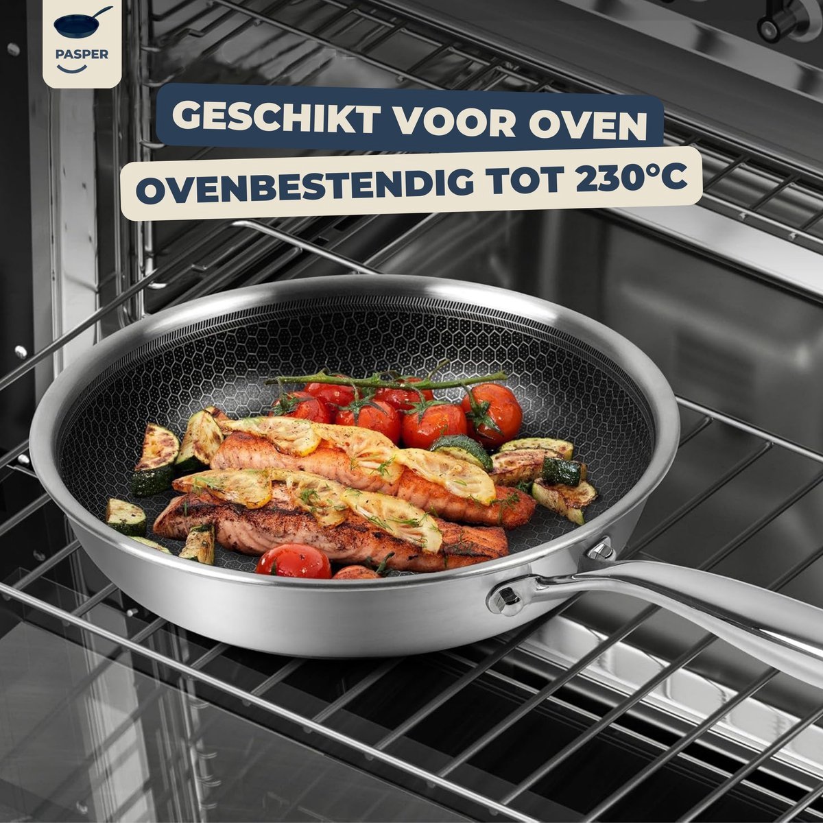 De Pasper hapjespan met deksel Ø 28 cm is een stevige RVS honingraat hapjespan die is ontworpen voor dagelijks gebruik en voor koks die graag bakken, braden én stoven in één pan. Dankzij een aluminium kern warmt de pan snel en gelijkmatig op, terwijl de krasbestendige honingraatlaag helpt om met weinig vet te koken zonder dat ingrediënten blijven kleven. De set is vrij van PFAS, PFOA en PTFE en werkt op alle warmtebronnen, inclusief inductie, en volgens de aanbieder ook in de oven tot 230°C.