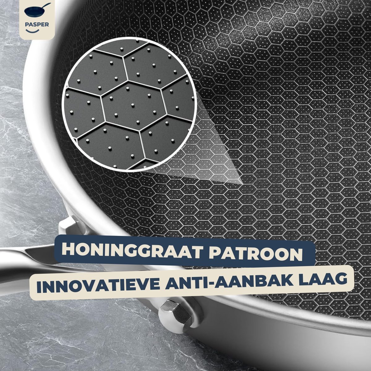 De binnenzijde heeft een honingraatstructuur. Dat is een patroon van verhoogde RVS-lijnen die de anti-aanbaklaag beschermen en het contact met spatels en bestek deels opvangen. In de praktijk betekent dit minder gevoeligheid voor krassen en een oppervlak dat bij goed gebruik voorkomt dat eten hard aankoekt. Het is geen wondermiddel: techniek en temperatuur blijven belangrijk. Maar de honingraat helpt in het dagelijks koken merkbaar, juist als je graag bakt met een klein beetje olie of boter.