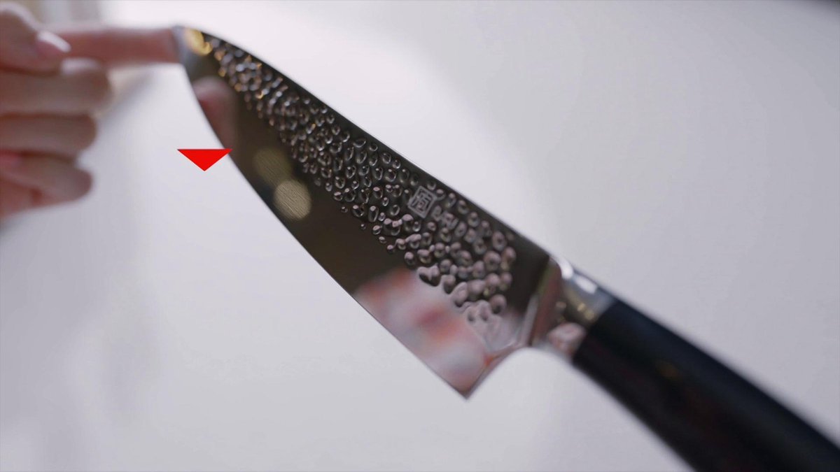 Het zichtbare, gehamerde oppervlak is vooral een esthetische keuze, maar helpt ook bij het verminderen van vacuümvorming tussen voedsel en lemmet. Dat is handig bij het snijden van natte ingrediënten zoals vis of sappige tomaten: de plakjes scheiden makkelijker van het blad.