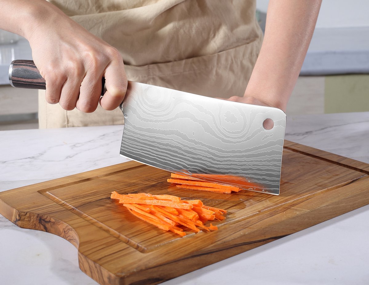 Gemaakt van hoogwaardig koolstofstaal en gehard met vloeibare stikstof, belooft dit mes langdurige scherpte en een solide hardheid van 56+ HRC. Het Damascus-stijl patroon geeft het lemmet een luxe uitstraling, zonder dat er concessies worden gedaan aan functionaliteit in de dagelijkse keukenpraktijk.