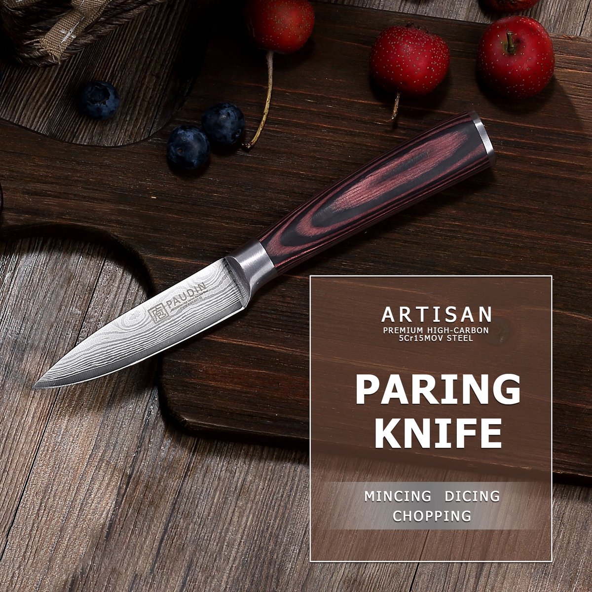 Het PAUDIN N8 RVS Japans groentemes is een compact, scherp en stijlvol keukenmes met een lemmet van 9 cm. Het is ontworpen voor precisiewerk zoals het snijden van groenten, fruit, kruiden en het fijne schil- en tourneerwerk. Door de combinatie van hoogwaardig koolstofstaal, een ergonomisch pakkahouten handvat en een ingelaserd damascuspatoon richt dit mes zich op thuiskoks en hobbychefs die snel, zuiver en gecontroleerd willen snijden.
