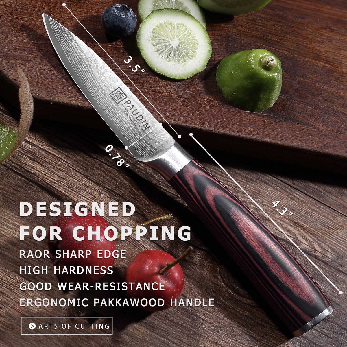 Het PAUDIN N8 RVS Japans groentemes is een precisietool voor Nederlandse thuiskoks die moeiteloos en gecontroleerd willen snijden. Met een 9 cm lemmet van hoogwaardig koolstofstaal levert het strak gesneden groenten en fruit, met een fraai ingelaserd Damascus patroon.