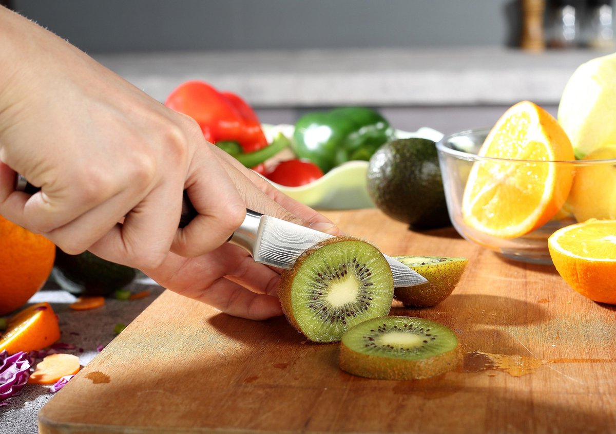 - Producten: Het mes blinkt uit in groenten en fruit. Voor harde schillen (bijvoorbeeld pompoen) is een groter, zwaarder mes geschikter. Voor delicate producten als tomaat en perzik helpt de fijne slijphoek om zonder druk te snijden en de structuur intact te houden.