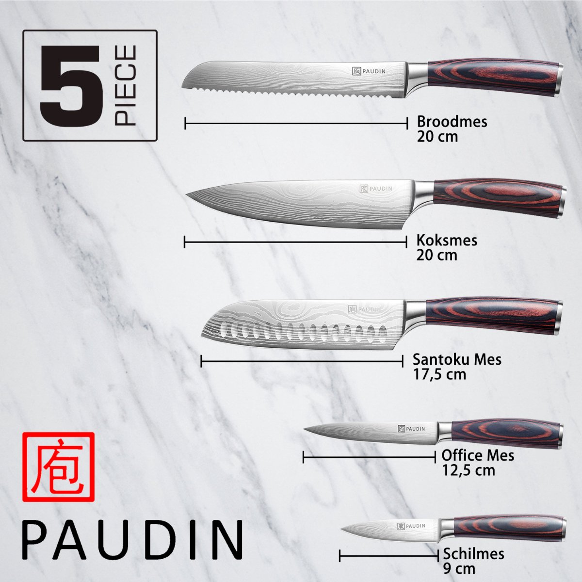 Dit is de PAUDIN NS5 Professioneel Koolstofstalen Japanse Messenset, ideaal voor thuiskoks in Nederland die precisie, veelzijdigheid en een stijlvolle uitstraling willen. De 5-delige set van koolstofstaal met ingelaserd damascuspatroon en hardheid >56 HRC biedt langdurige scherpte en moeiteloos snijden.