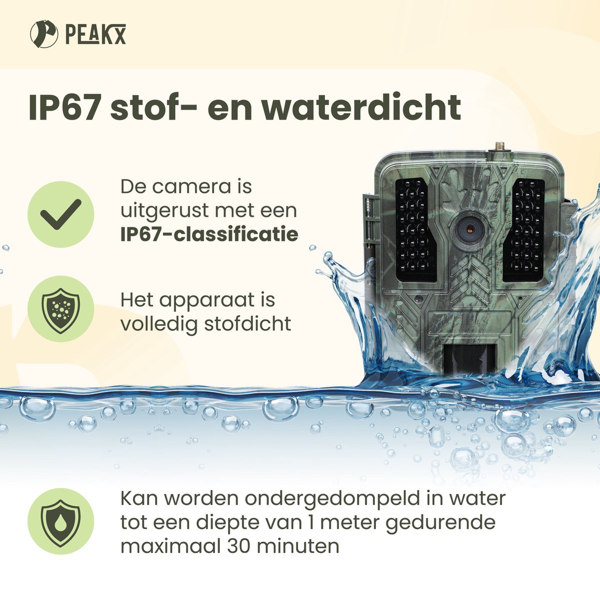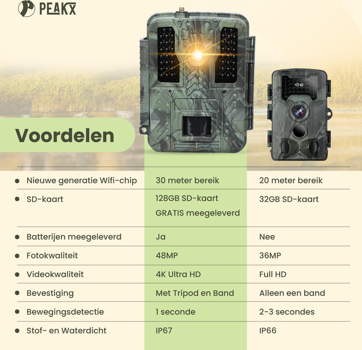 Overzicht:De PeakX wildcamera is ideaal voor Nederlandse natuurliefhebbers en tuineigenaren die dieren en veiligheid dag en nacht willen volgen. De camera maakt scherpe 4K-video’s en 48MP-foto’s en wordt geleverd met een 128GB SD-kaart.