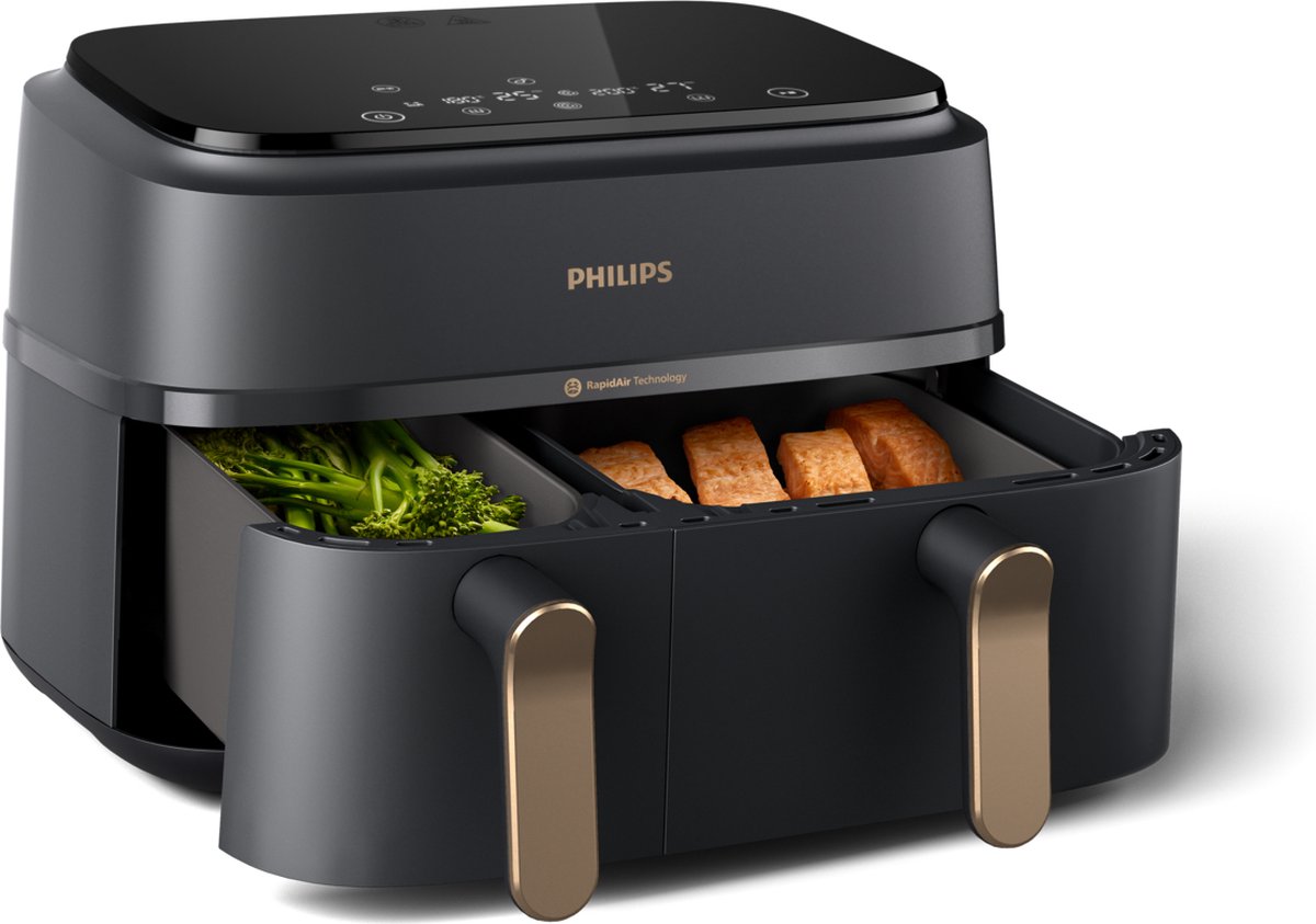 De Philips Airfryer met twee manden maakt gelijktijdig koken eenvoudig voor Nederlandse huishoudens. Met 9 liter totale capaciteit serveert u hoofd- en bijgerechten samen, knapperig en mals.