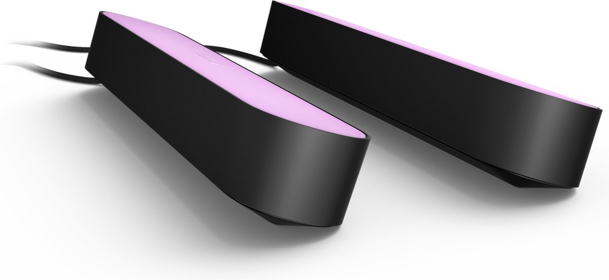 Overzicht:Ultieme slimme verlichting voor Nederlandse woonkamers: twee zwarte Hue Play-lichtbalken, compatibel met de Philips Hue Bridge. De set bevat een voeding die tot drie Hue Play-lichtbalken op één stopcontact ondersteunt.