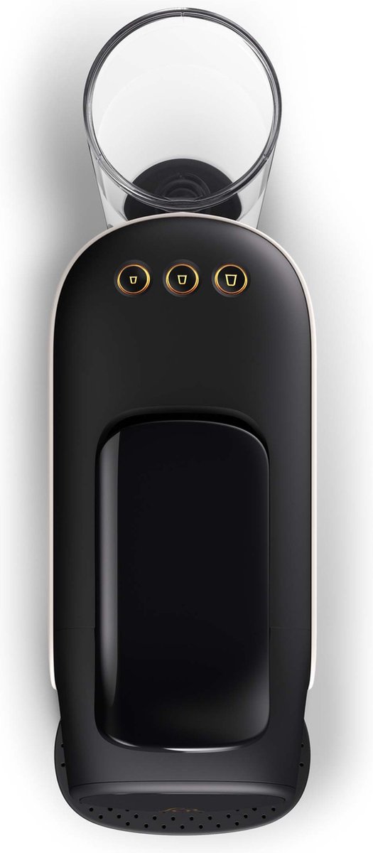 Bovenop zitten drie knoppen (van links naar rechts): ristretto, espresso en lungo. Het apparaat hoeft niet apart aangezet te worden om op te warmen; bij gebruik warmt het vanzelf op. Bij het tweede kopje merk je dat de opwarmtijd aanzienlijk korter is. Voor een espresso plaats je gewoon een capsule en druk je op de espressoknop; het apparaat stopt automatisch na de vooringestelde hoeveelheid water. Wij vonden die hoeveelheid eerst te weinig en hebben hem eenvoudig aangepast — daarna zet het apparaat elke espresso met de door ons ingestelde hoeveelheid. Heel handig.