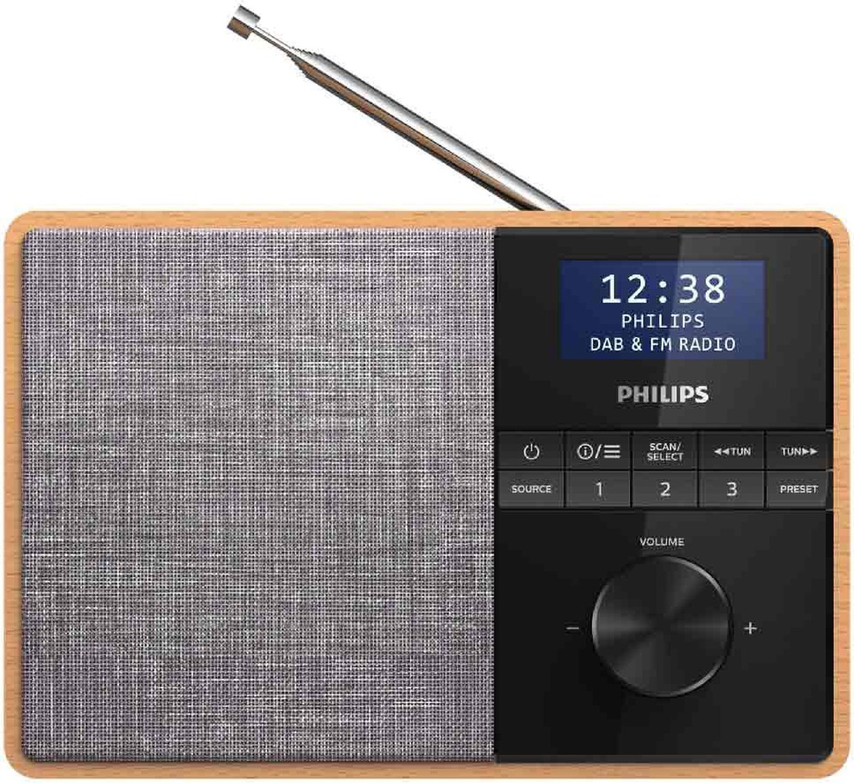 De behuizing van de Philips R5505/10 combineert een lichte houten omkasting met een zwart, glanzend scherm en een frontpaneel met grijze luidsprekerstof. Dat geeft de radio een warme, maar moderne uitstraling die goed past in veel keukens. De knoppen voor afstemming en bronselectie zitten aan de voorkant; een slanke draaiknop regelt het volume — handig tijdens het koken wanneer je met één hand wil bijsturen.