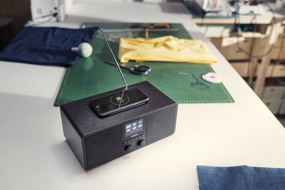 Er is een duidelijk, groot digitaal tijddisplay en overzichtelijke bedieningstoetsen op het voorpaneel, waardoor de bediening intuïtief is zonder grote afstandsbediening. De bovenkant met draadloos oplaadpad is praktisch als je de radio op je nachtkastje gebruikt: je legt je telefoon erop en hij laadt op terwijl je slaapt.
