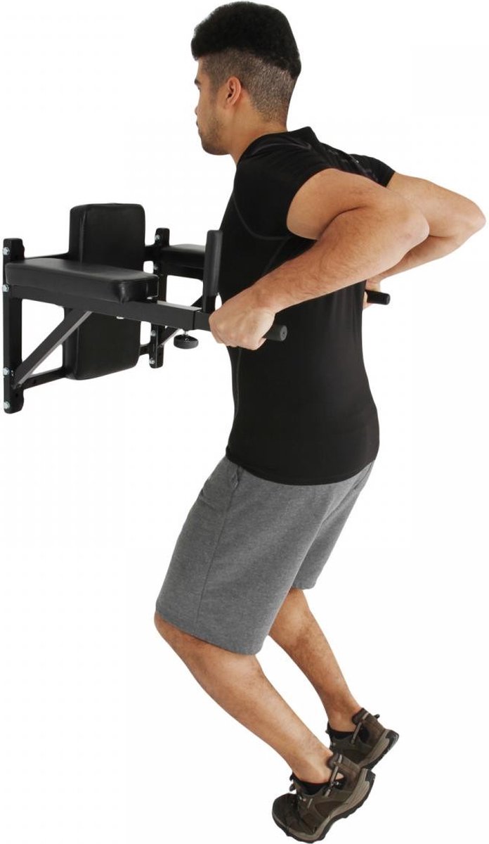 Het feit dat het toestel aan de muur wordt gemonteerd en relatief compact is (ca. 60 x 50 x 58–69 cm) maakt het geschikt voor kleine appartementen en thuisruimtes waar een losse power rack of dipstand niet past. Ideaal voor wie geen extra vloeroppervlak kan opofferen.