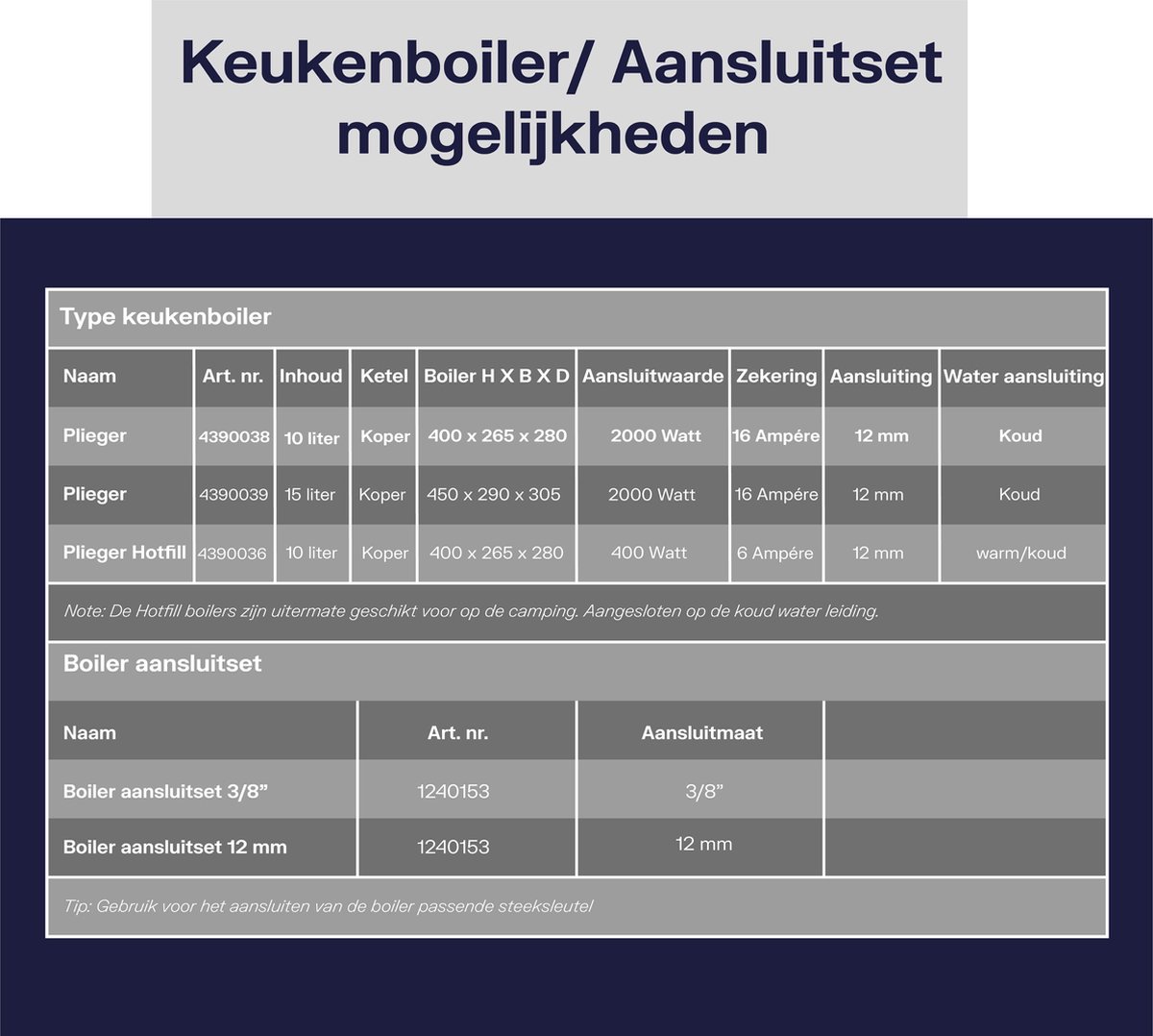 Kort koopadvies: wil je zonder gedoe direct warm water aan de kraan, kies de Plieger keukenboiler 10 liter; heb je structureel meer vraag, ga voor 15 liter; heb je een warme aanvoer dichtbij, overweeg de warmwater-variant.
