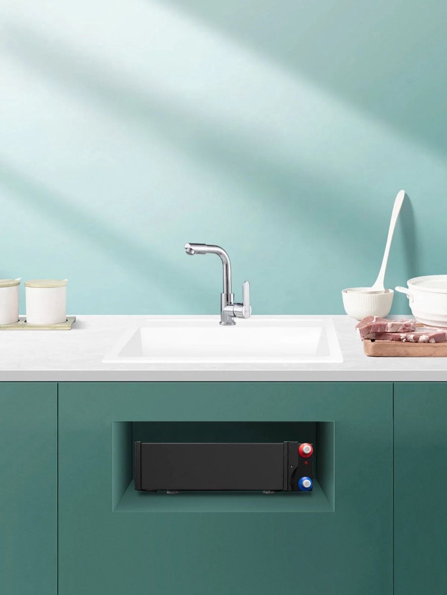 Dit is een compacte plintboiler voor direct warm water in de keuken. Perfect voor huishoudens in Nederland die ruimte willen besparen en sneller afwassen of koken; de inhoud is 5 liter.