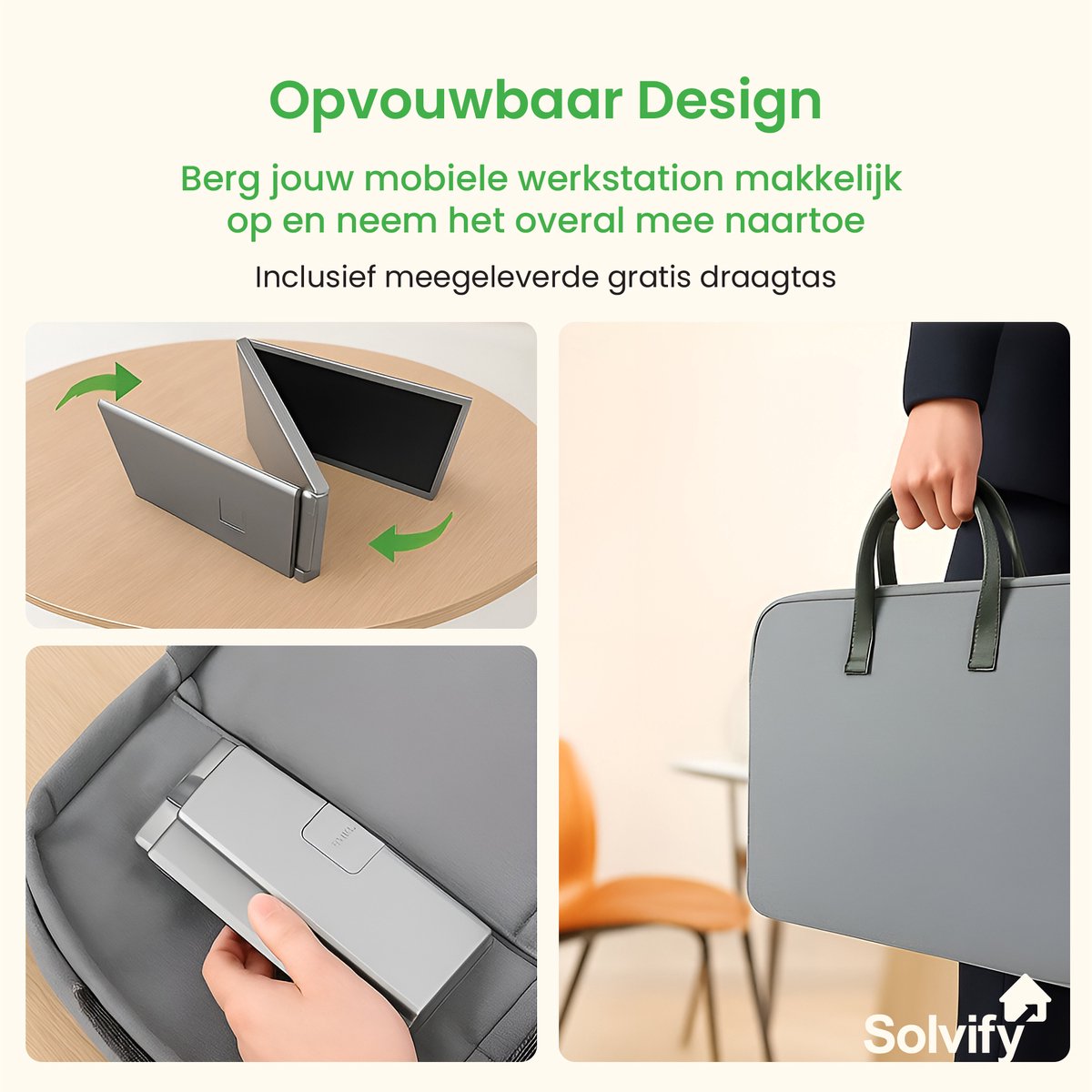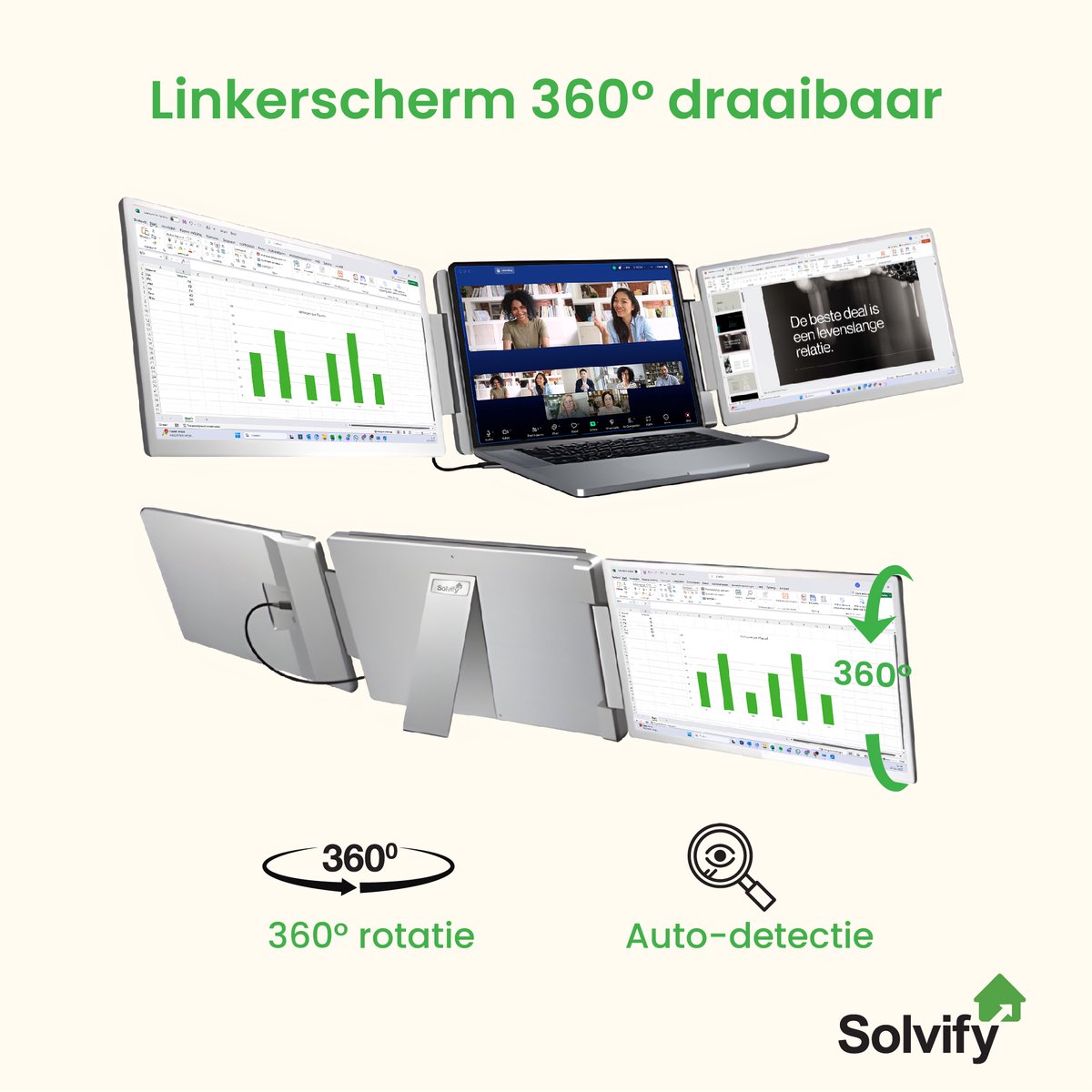Werk zonder vensterwissel: de Solvify® Spin Portable Monitor voegt in seconden twee extra schermen toe, zodat Nederlandse thuiswerkers en reizigers overzichtelijker en sneller werken. Twee 15,6‑inch 1920×1080 IPS‑schermen klappen uit en kunnen meedraaien richting je gesprekspartner.