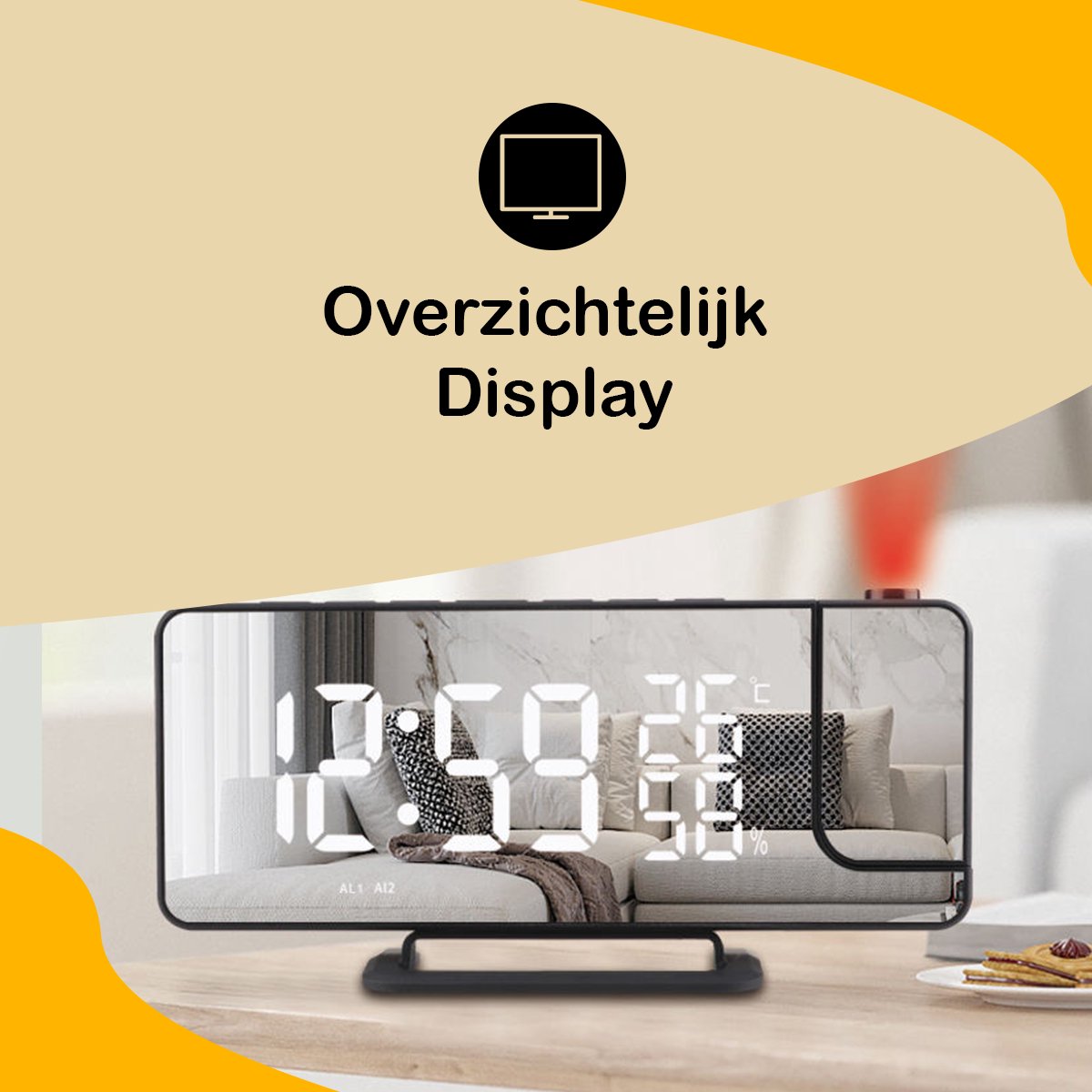 De projectiefunctie werpt de tijd op de muur of het plafond en is in drie standen in te stellen: hoog, laag of uit. Dankzij de 180° draaibare projector kun je de projectie op verschillende plekken in de slaapkamer richten zonder het apparaat te verplaatsen. Dit is handig als je in bed ligt en de tijd op een specifieke plek wilt zien zonder naar het display zelf te kijken — vooral prettig bij lage lichtomstandigheden.