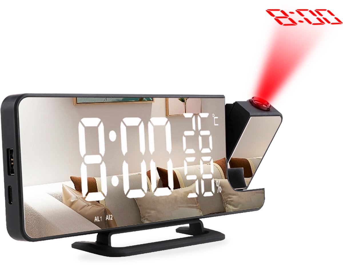 - Projecteer de tijd op muur of plafond met 180° draaibare projector.