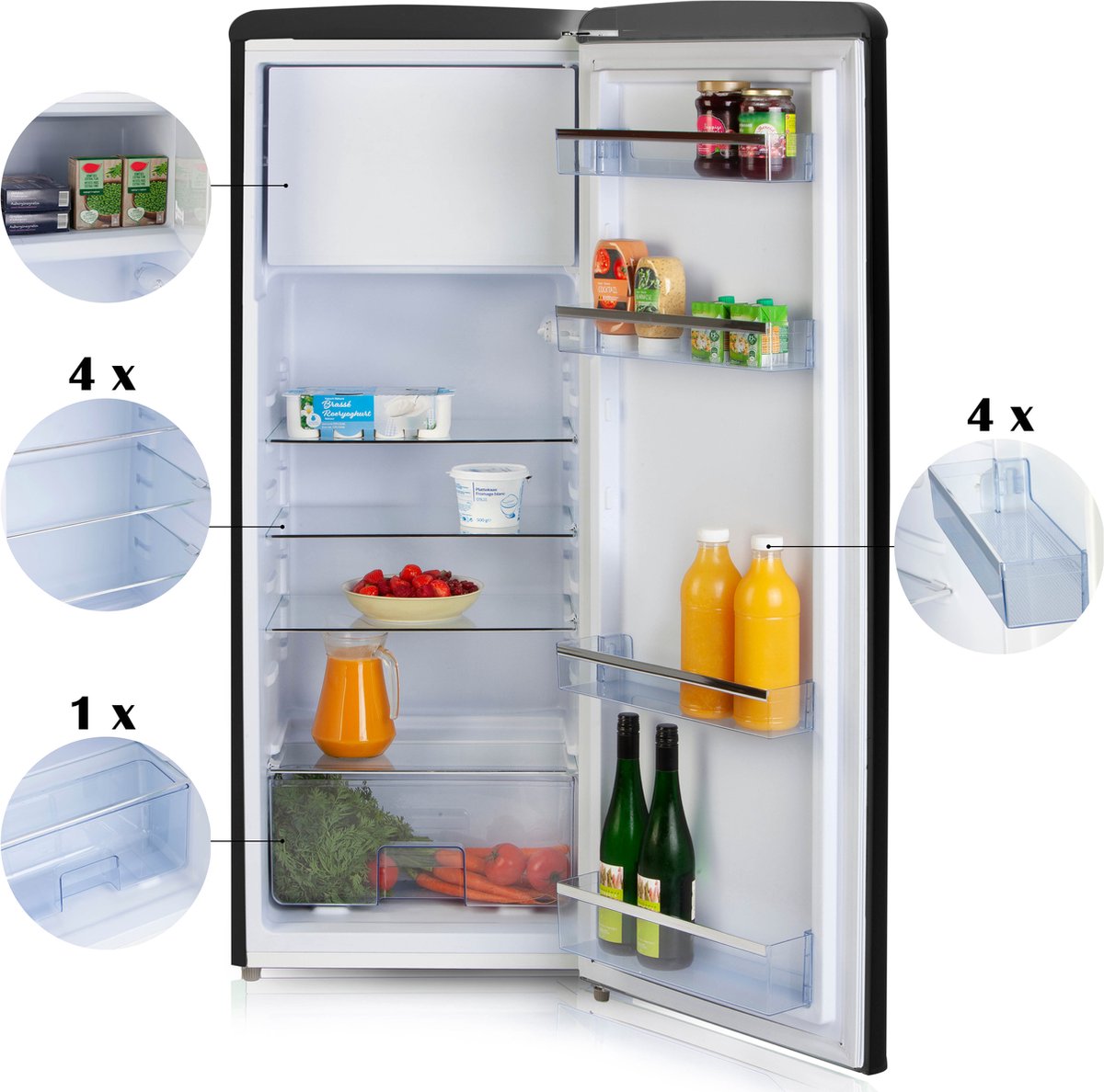 Stijlvolle retro koelkast in zwarte uitvoering; echte blikvanger in de keuken Vriesvak is compact (24 liter) en minder geschikt voor grootverbruik