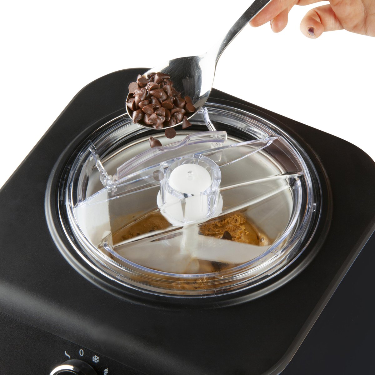 - Knapperige mix-ins: voeg gehakte noten of koekstukjes pas toe tegen het einde, via de vulopening.