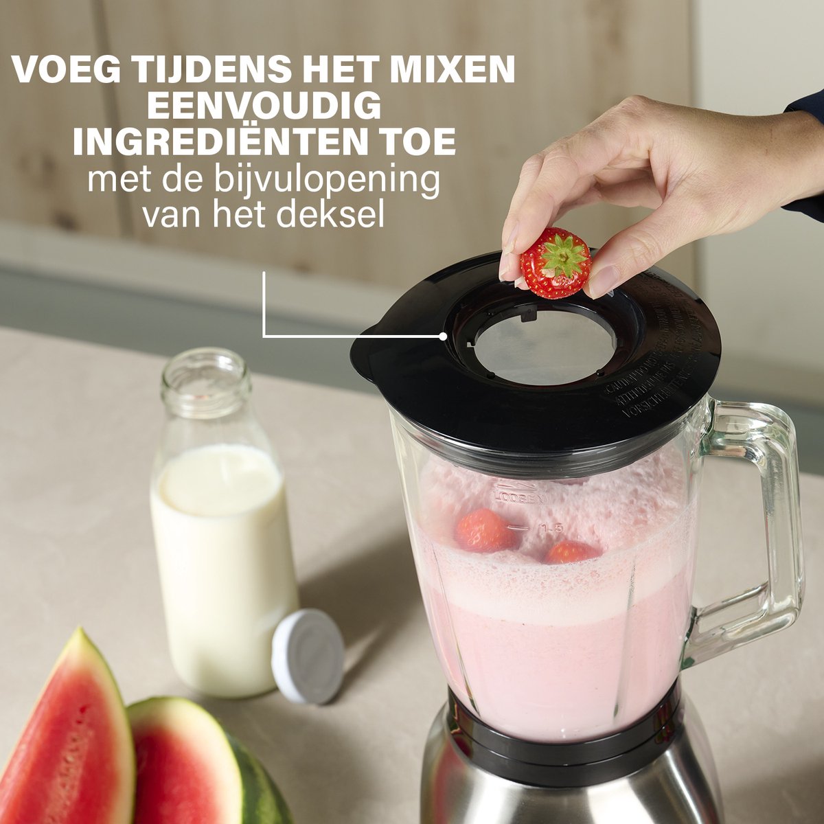 De kan is van glas en heeft een inhoud van 1,5 liter. Dat betekent: voldoende ruimte voor meerdere porties in één keer, bijvoorbeeld vier grote smoothies voor het gezin of een soepje als voorgerecht voor tafelgasten. Glas is bovendien prettig in gebruik omdat het niet snel verkleurt en geuren minder vasthoudt. Exacte afmetingen en gewicht van het apparaat zijn niet vermeld, maar reken erop dat een glazen kan iets zwaarder en stabieler aanvoelt dan een kunststof variant. Qua ergonomie is de bediening bewust eenvoudig gehouden: een duidelijke draaiknop voor de snelheden plus een aparte pulseerstand. De deksel heeft een navulopening, zodat je tijdens het mixen extra vloeistof of ingrediënten kunt toevoegen zonder te morsen.