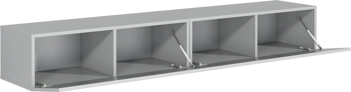 Het hangende ontwerp geeft direct rust aan een ruimte doordat het meubel de vloer vrijlaat en visuele ‘zweving’ creëert. Het frame en de panelen zijn gemaakt van spaanplaat, wat zorgt voor een stevige basis met een nette, egale afwerking. Spaanplaat is economisch en biedt goede stabiliteit voor een tv-meubel dat niet extreem belast wordt.
