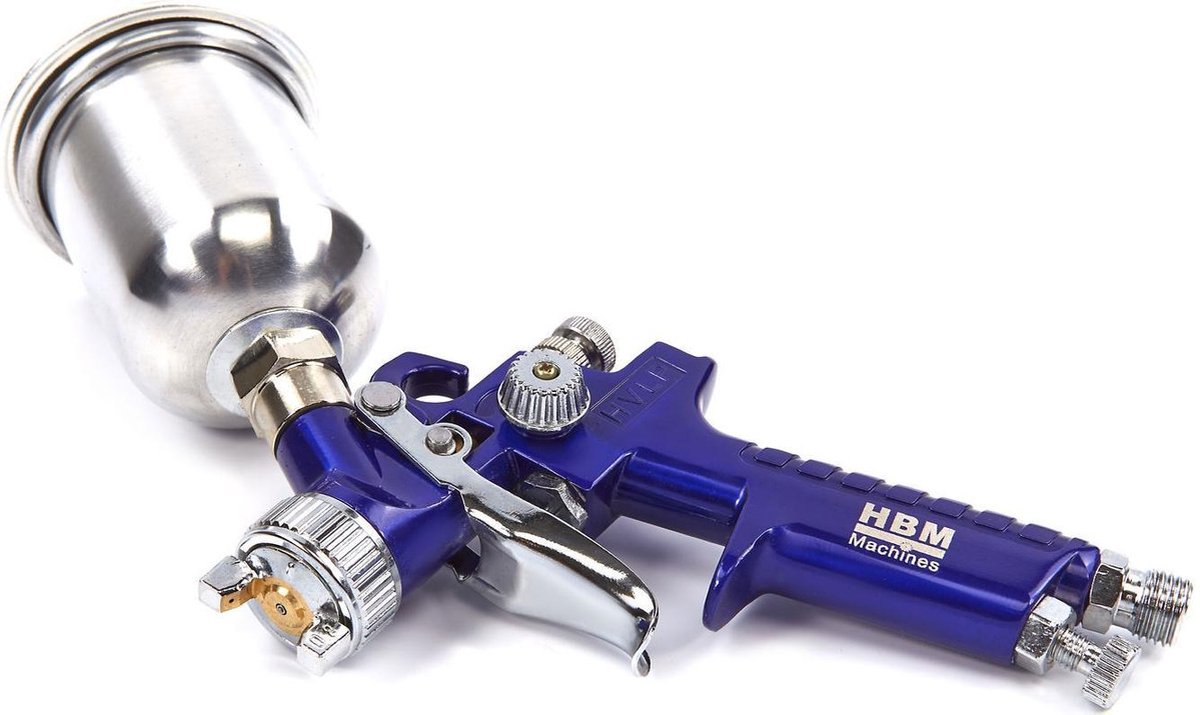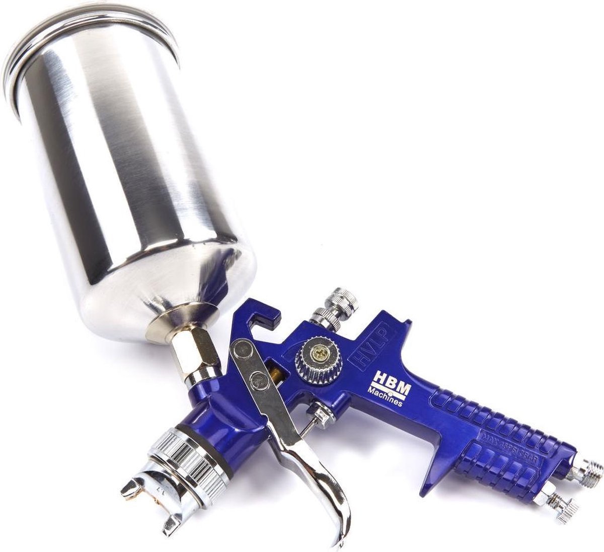 | Drie aluminium bekers: duurzaam, licht en snel wisselen tussen 200 ml en 600 ml | Geen vermelde werkdruk of luchtverbruik; afstemmen met je compressor vergt eigen test |