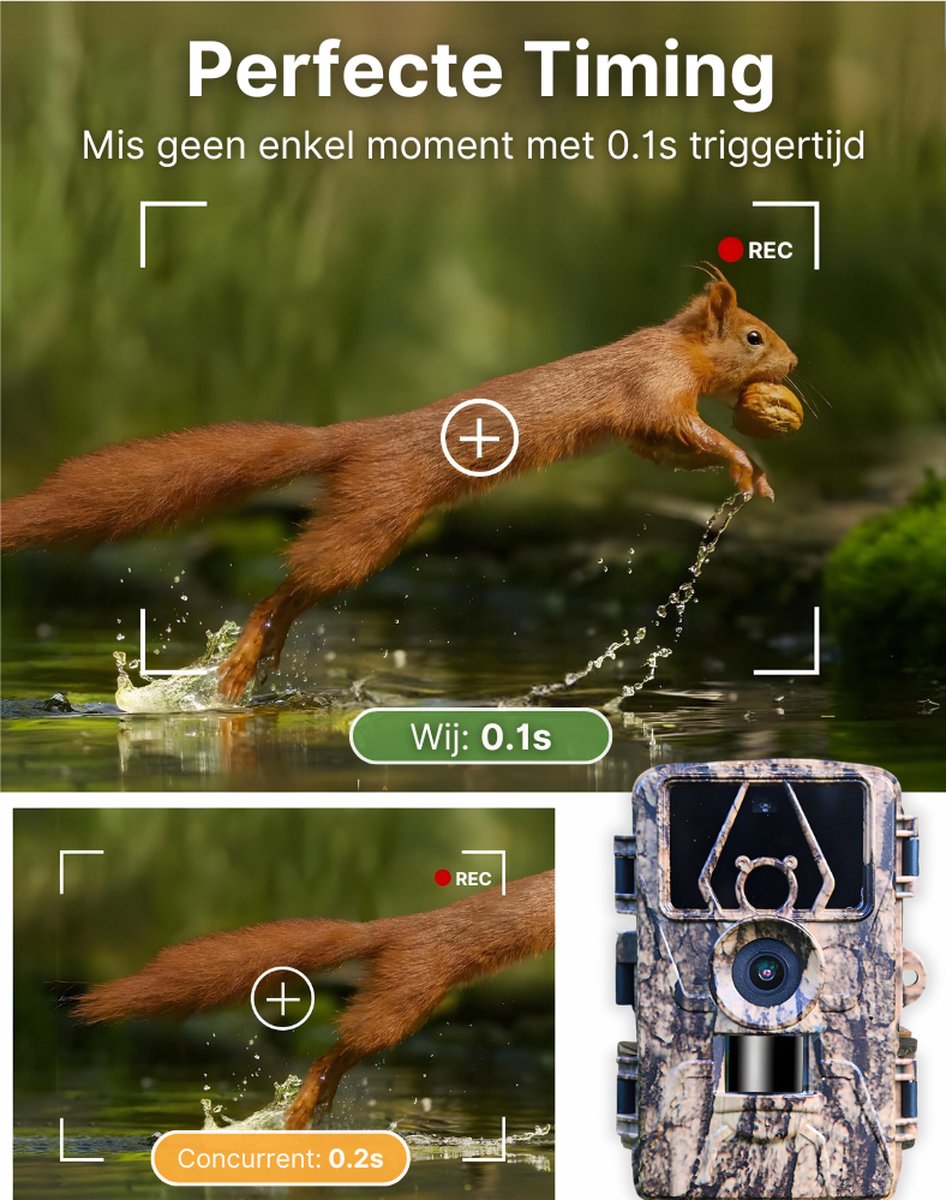 Waar dit helpt: bij snelle dieren zoals hazen of marters die slechts een fractie van een seconde in beeld zijn. Een korte triggertijd minimaliseert het risico op lege frames of gemiste acties.