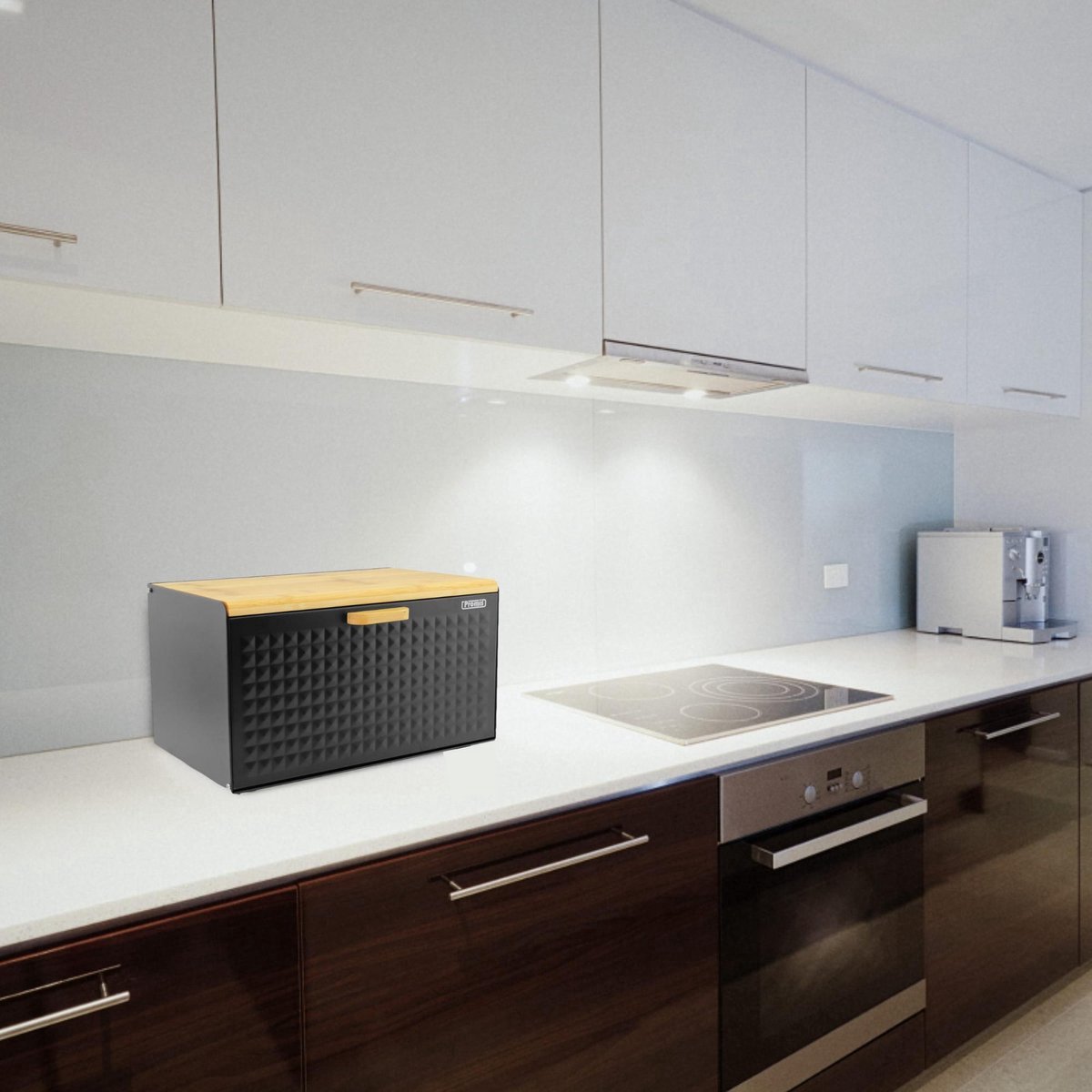 Een moderne broodtrommel die brood langer vers houdt en extra werkruimte oplevert. Ideaal voor Nederlandse keukens dankzij het doordachte ontwerp dat stijl en gemak combineert. Afmetingen: 36 × 21 × 21,5 cm.