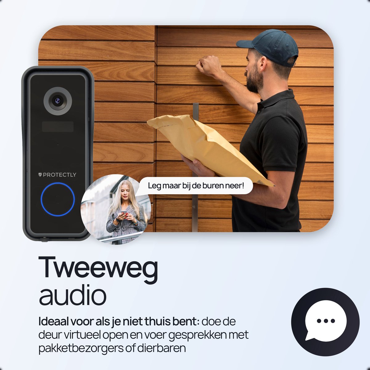 Met tweeweg audio spreek je bezoekers toe via de app en hoor je hen terug. Zo kun je pakketbezorgers vragen een doos bij de buren af te geven of achter de schutting te plaatsen. Ook prettig als je alleen thuis bent en eerst wilt verifiëren wie er aan de deur staat. In het dagelijks gebruik bespaart dit tijd en voorkomt het gemiste zendingen.