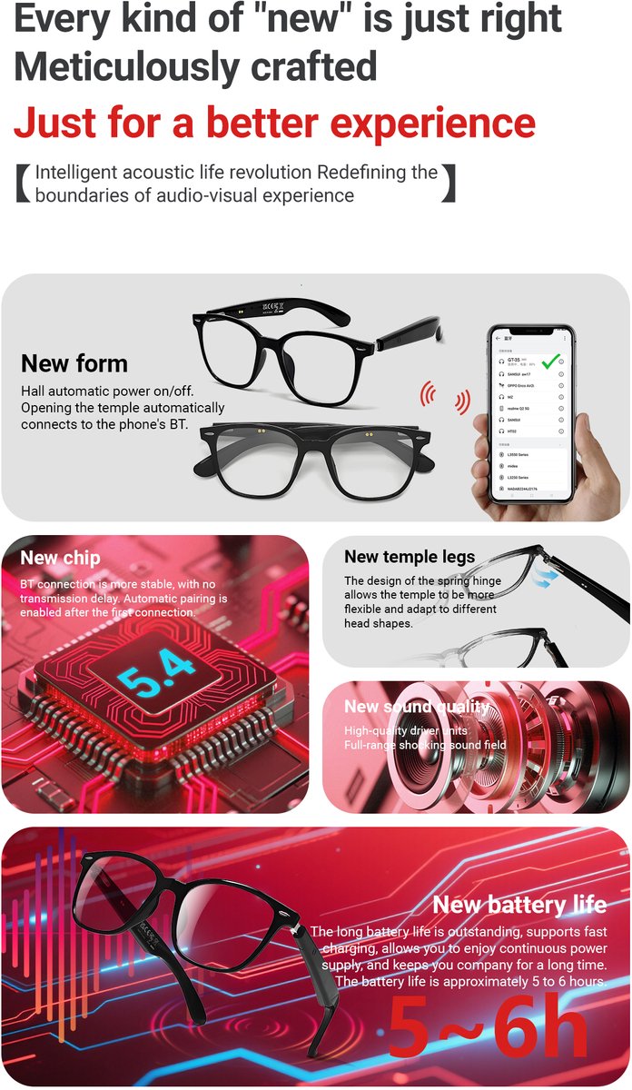 De bril gebruikt chipset Zhongke Bluexun AB5656C en ondersteunt Bluetooth 5.4 met een ontvangstbereik van circa 10 meter. Dit biedt stabiele verbinding binnen normale gebruiksomstandigheden (telefoon in jaszak of rugzak), en zorgt voor lagere latency en verbeterde verbindingsstabiliteit vergeleken met oudere Bluetooth-versies.