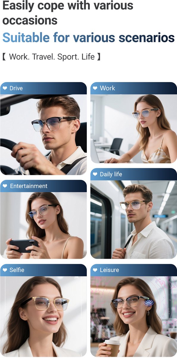 - Zakenmensen die onderweg handsfree vergaderingen willen beluisteren en een representatieve, modieuze bril prefereren.