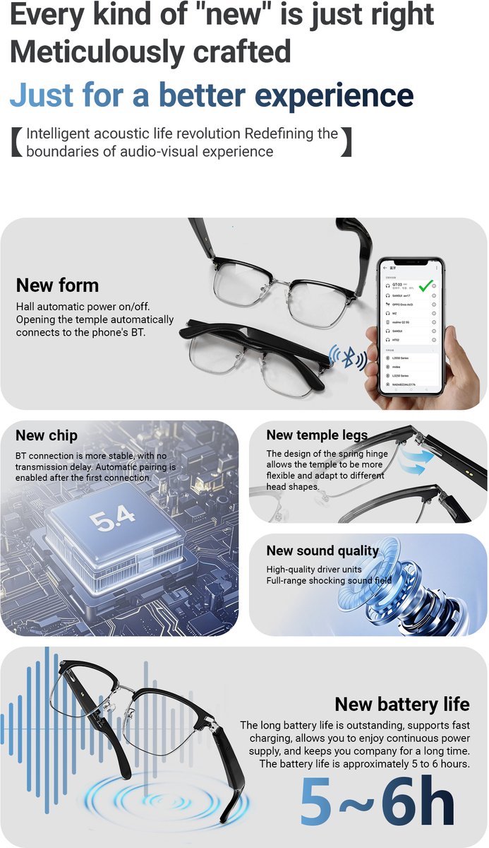 Blauwlichtblokkerende lenzen en modieuze uitstraling | Open speakerontwerp laat omgevingsgeluid binnen |