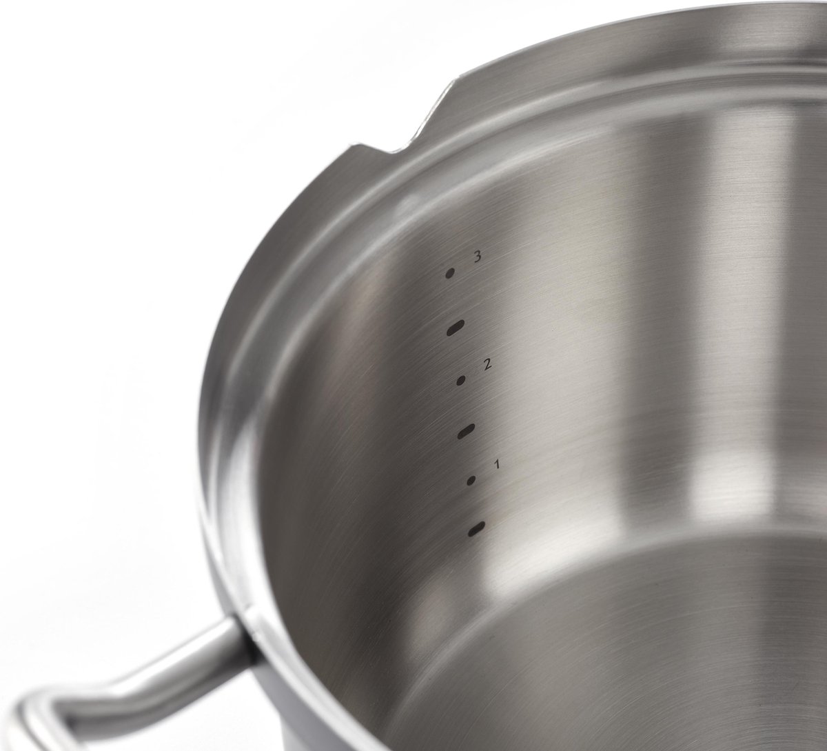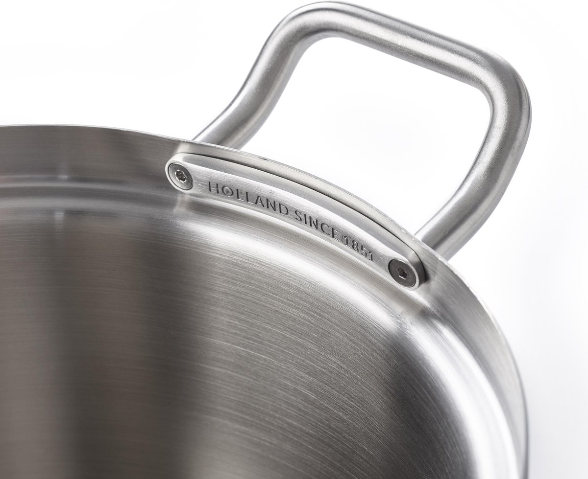 Zeer hoog geplaatste grepen geven meer kookruimte en veiligheid | Geen informatie over wanddikte, warmtegeleiding of meerlagenbodem |