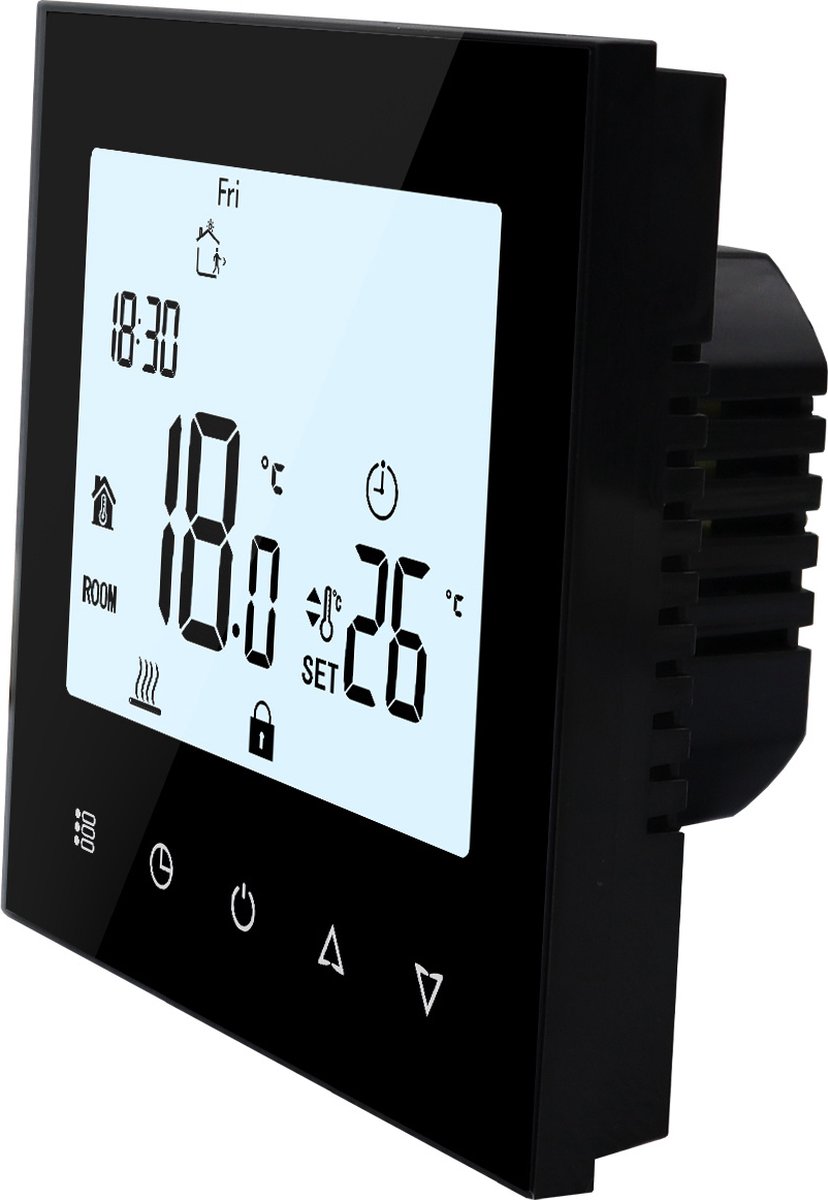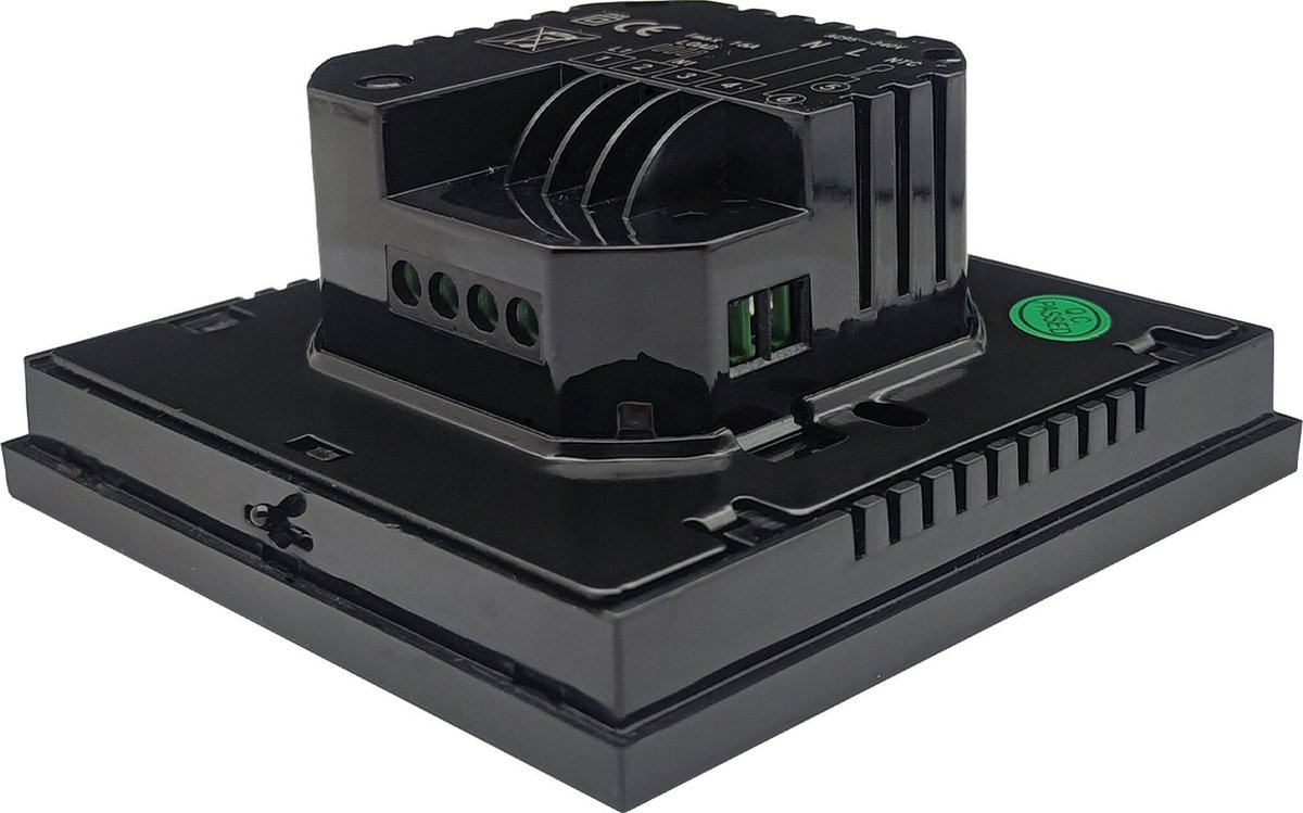 Qua formaat is hij compact: 85 x 84 x 32 mm. Die 32 mm inbouwdiepte is gangbaar voor thermostaten met een relais dat 16 A kan schakelen. In de praktijk betekent dit dat je hem in de meeste standaard inbouwdozen kunt plaatsen. Let bij montage wel op de diepte van je inbouwdoos en de kabeldoorvoer: de extra ruimte voor het relais en de klemmen is welkom, zeker als er meerdere draden binnenkomen (bijvoorbeeld voeding, schakeldraad en vloersensor).