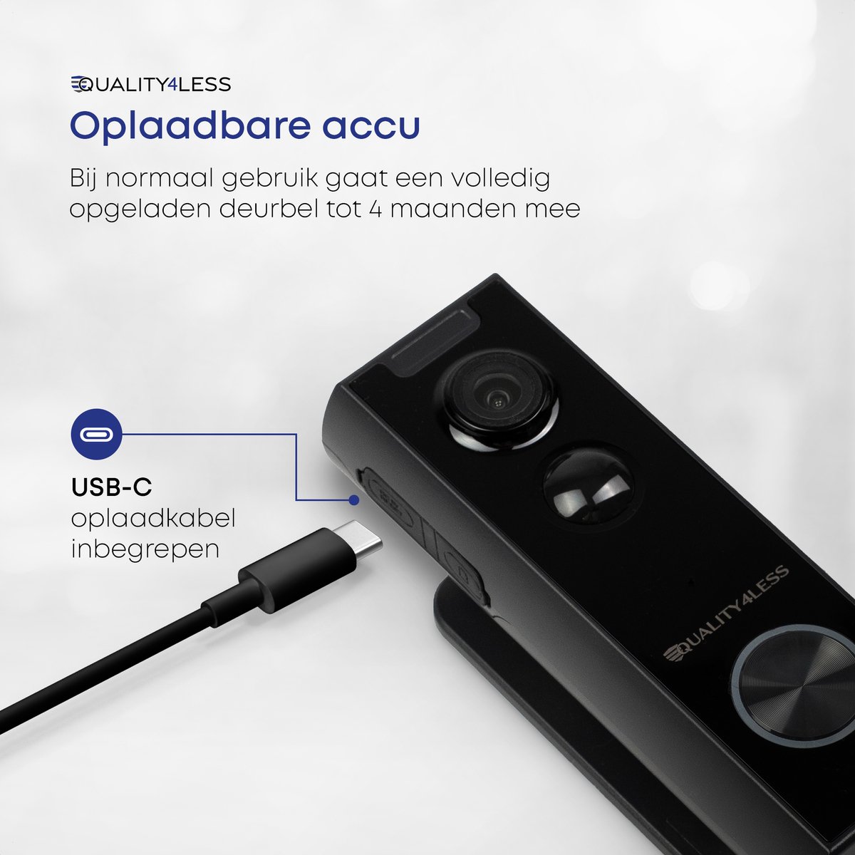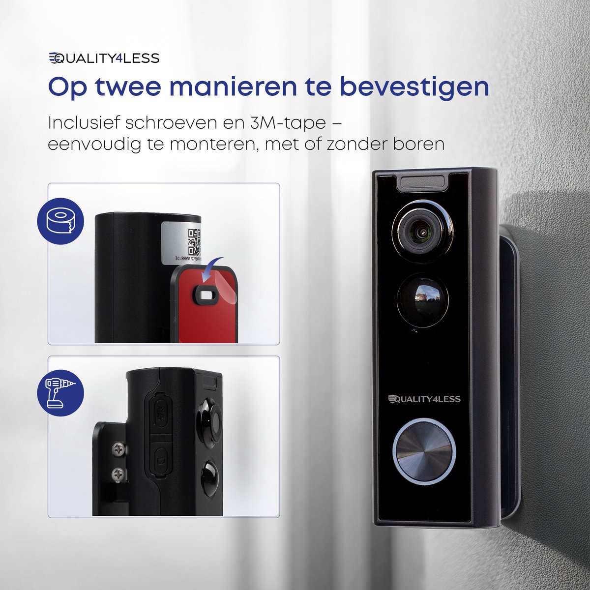 Dit is een slimme videodeurbel van Quality4less die beeld, geluid en meldingen op je telefoon combineert met lokale opslag op een meegeleverde geheugenkaart. Het doel: je ziet en hoort altijd wie er aanbelt of rond je voordeur beweegt, zonder maandabonnement.