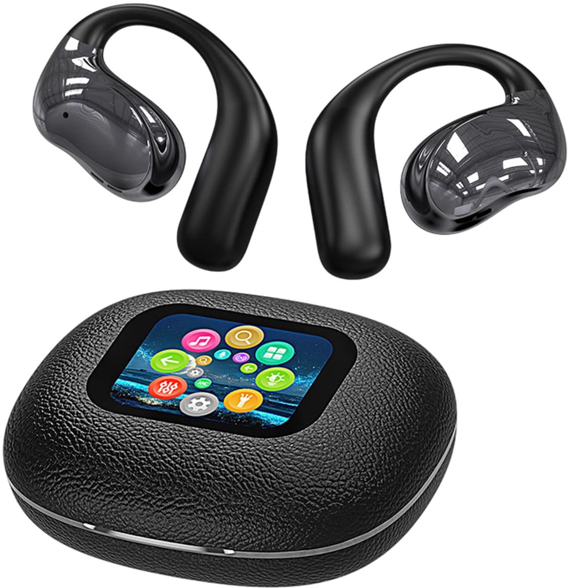 De RE70 combineert het compacte format van draadloze oordopjes met een opvallend touchscreen op de oplaadcase. Materiaalkeuze is niet volledig gespecificeerd, maar de behuizing oogt kunststof met een glanzende afwerking rond het display. Het ontwerp wordt omschreven als lichtgewicht en ergonomisch; de oortjes zouden prettig blijven zitten zonder snel te verschuiven. Omdat het product ook als “open-ear koptelefoon” wordt genoemd, lijkt het model gericht op een balans tussen draagcomfort en omgevingsbewustzijn — handig als je onderweg gesprekken wilt volgen of omgevingsgeluiden wilt blijven horen.