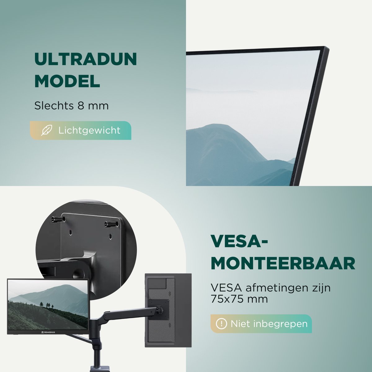 De Remodius 16‑inch monitor is ontworpen met mobiliteit als uitgangspunt. Met een dikte van circa 15 mm en een gewicht van ongeveer 650 gram (volgens de productvermelding) past hij moeiteloos in je rugzak of laptoptas. Dat lage gewicht maakt hem prettig voor forenzen en reizigers die hun apparatuur vaak moeten in- en uitpakken of veel te voet zijn. Het formaat van 16 inch vormt een fijne balans: merkbaar meer werkruimte dan 13–14 inch, maar nog steeds compact.