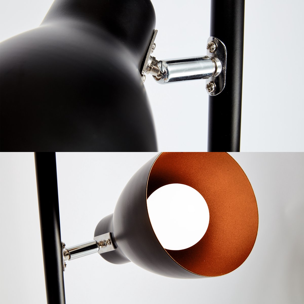 - Plaatsing: zet de lamp naast een leesstoel of bank zodat minimaal één kap naar beneden gericht kan worden voor taakverlichting, en de andere richt je desgewenst naar de muur voor sfeerverlichting.