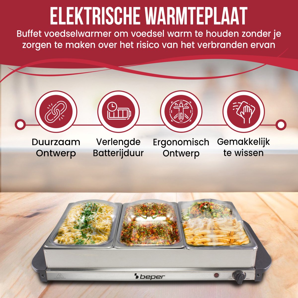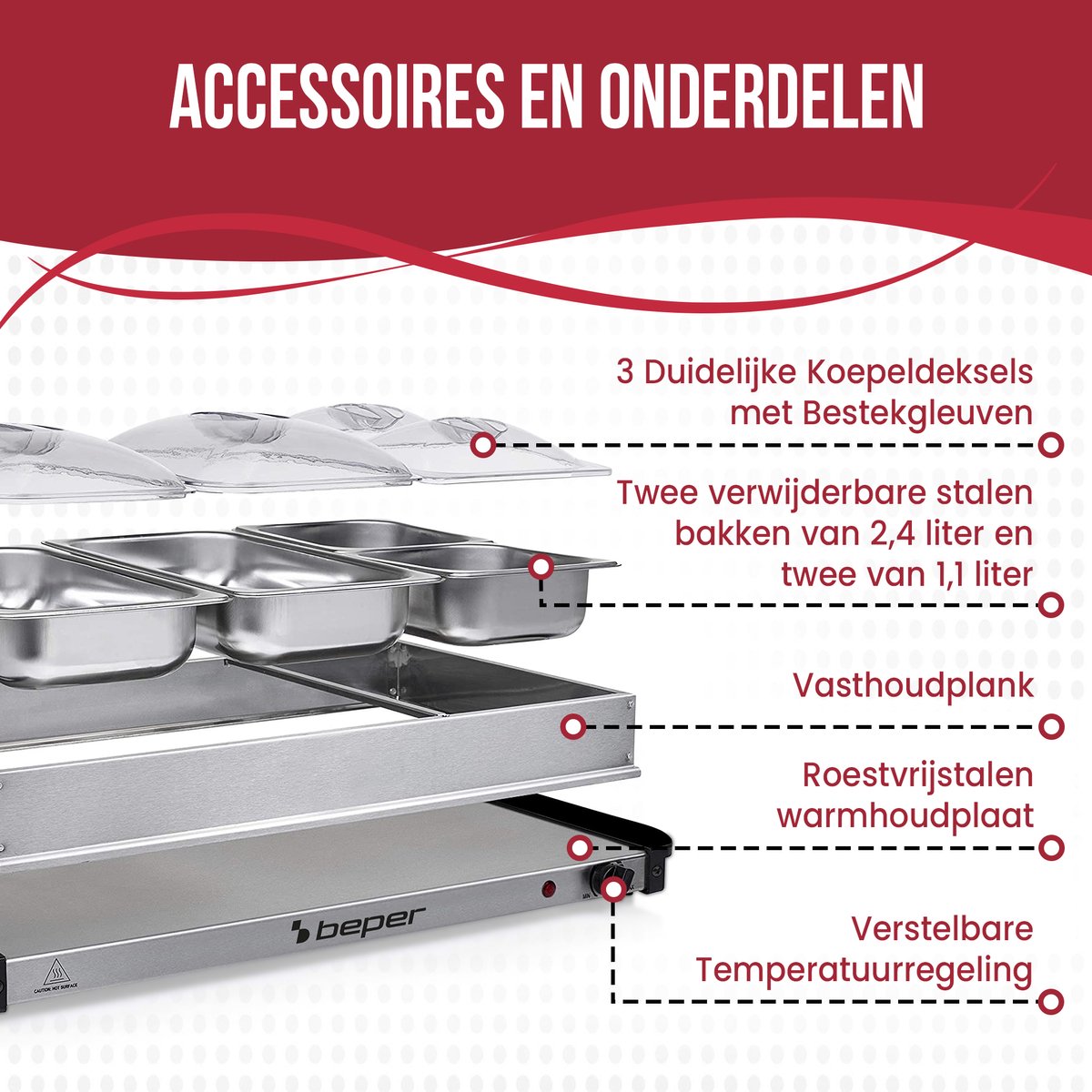 De Beper warmhoudplaat is een elektrische buffetoplossing bedoeld om meerdere gerechten tegelijk op temperatuur te houden tijdens feestjes, buffetten of familiediners. Het apparaat biedt twee grote bakken van 2,4 liter en twee kleinere bakken van 1,1 liter, een deksel en een instelbare thermostaat, verpakt in een roestvrijstalen behuizing.