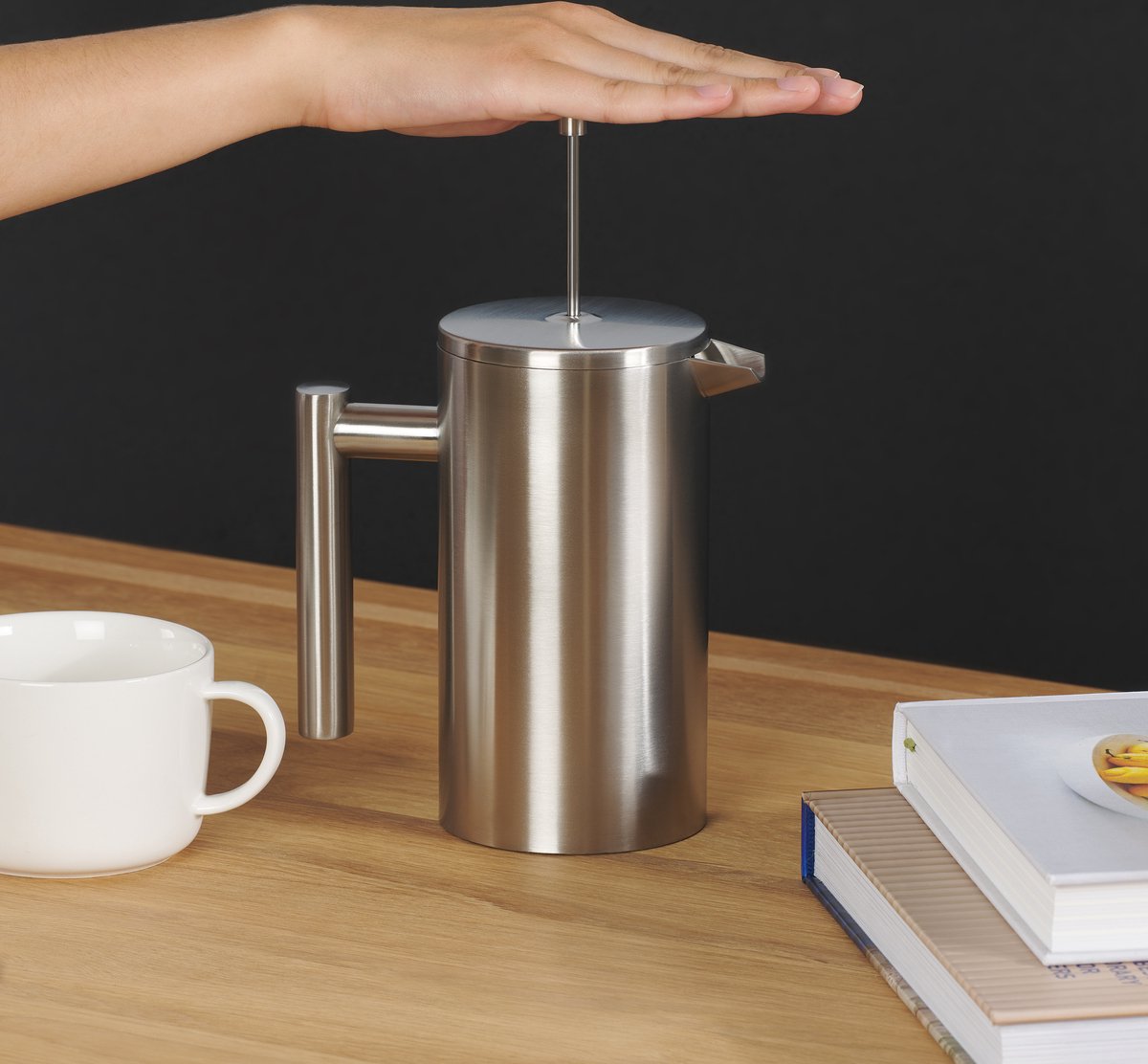 Deze franse pers is een volledig metalen koffiezetter die is ontworpen om koffie warm te houden tot het moment van uitgieten. De behuizing en zuiger zijn gemaakt van 304 roestvrij staal (0,8 mm) en de kan heeft een dubbele vacuümlaag, waardoor warmtebehoud en duurzaamheid centraal staan. Omdat er geen filters of capsules nodig zijn, is het een eenvoudige, herbruikbare manier om koffie te zetten zonder afval.